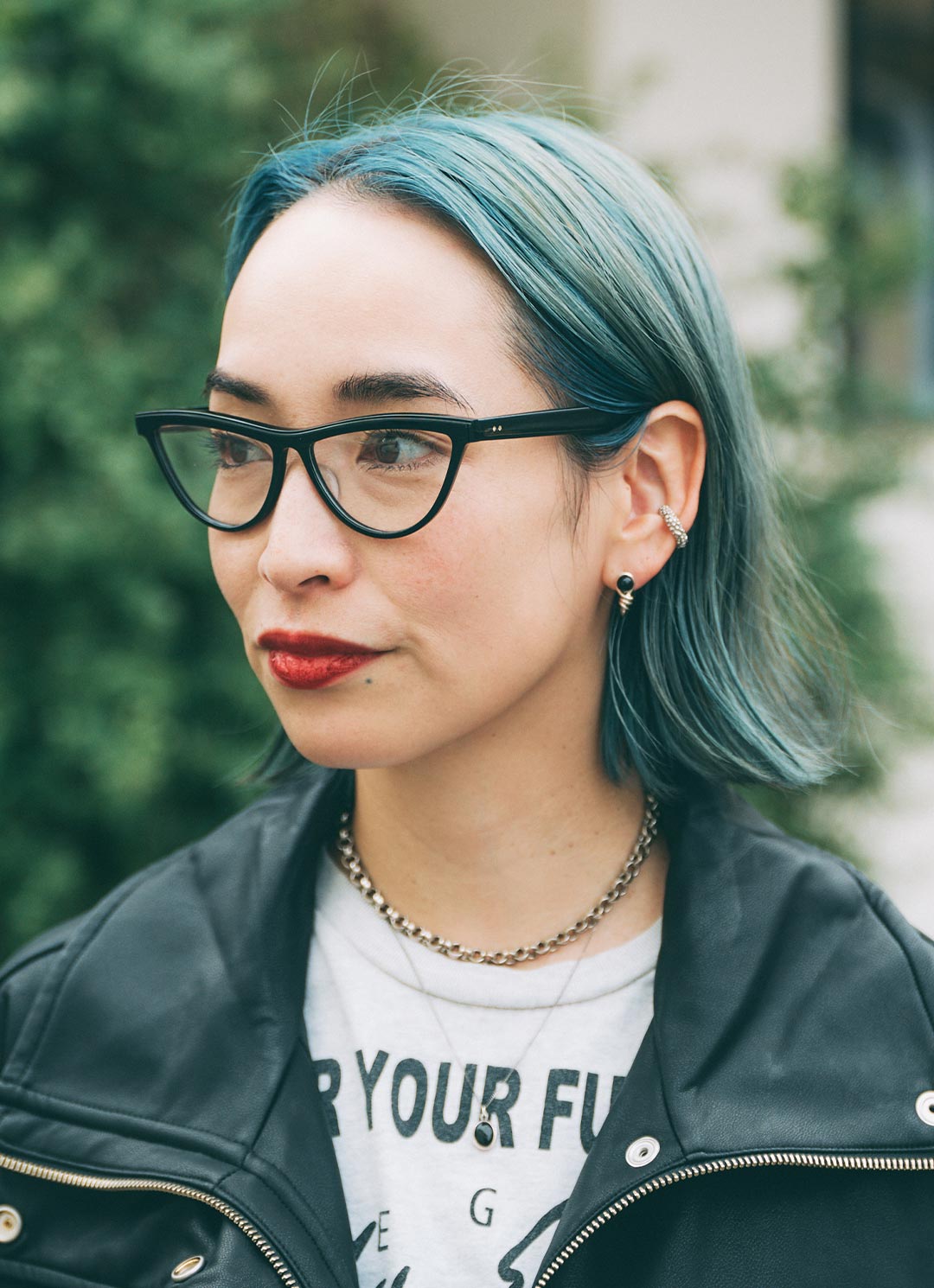メンズライクな装いを『ルネッタバダ』のメガネでレディなエッセンスをひとさじ。シルバーのアクセサリーをレイヤードして上品な顔周りに昇華!