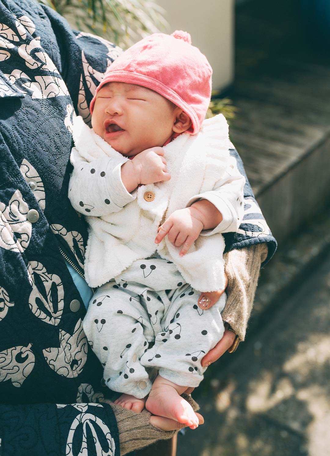 ピンクのボンネットがキュートなアクセント役に大抜擢! さくらんぼ柄のロンパースともこもこベストで、赤ちゃんらしいぬくもりある装いが完成♪