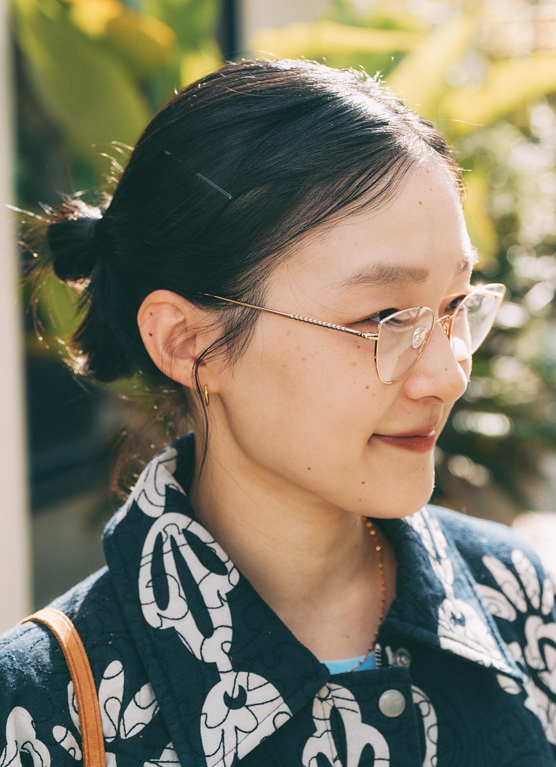 『アーレム』のキャットアイなメガネで、エレガントな雰囲気を漂わせたのがグッド! ミニマムなピアスにレッドリップを添えて、上品な顔周りに仕上げ。