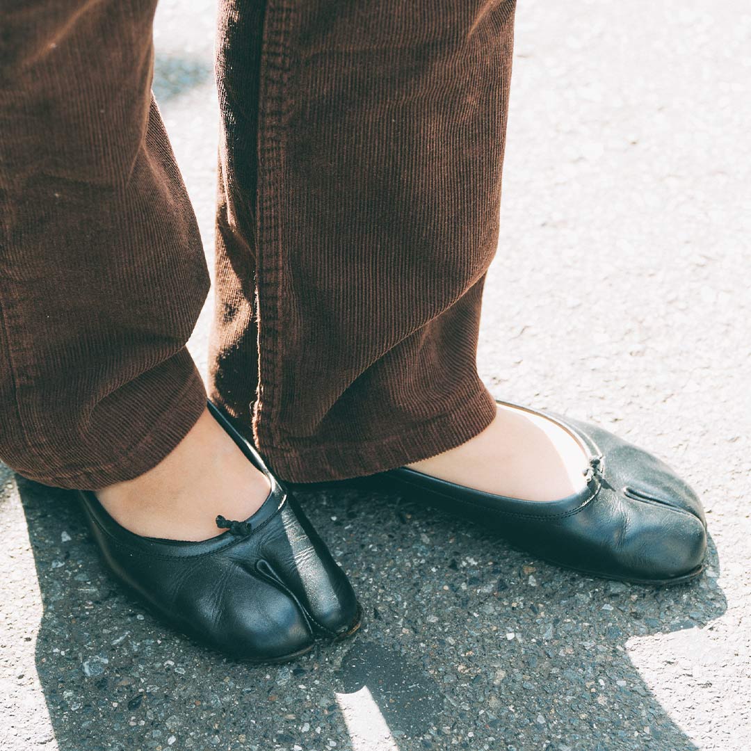 『メゾン マルジェラ』のタビシューズでモードな足元コーデ。ブラウンのボトムスと相性抜群で、大人の余裕を感じさせる冬の装い。