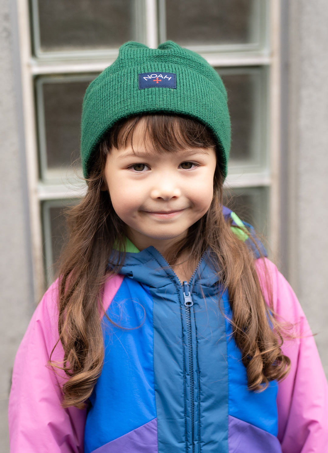シルエットがきれいな『ノア』のニット帽。にぎやかなアウターに対して、コクのあるグリーンで落ち着かせて。