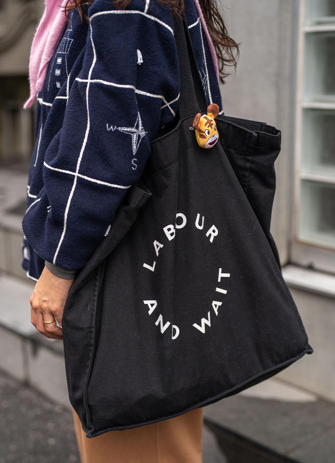スクエアフォルムがひとクセ効いているトートバッグ。トラのバッジを付けて、ユニークさをプラス!