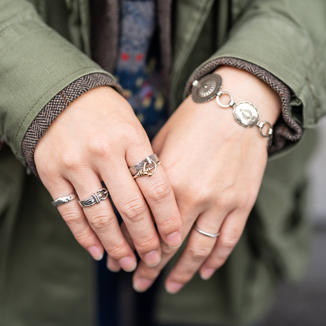 シルバーアクセサリーをレイヤードして、手元に華やぎをプラス。『ティファニー』『エルメスヴィンテージ』などのブランドMIXが上品に装いを格上げ!