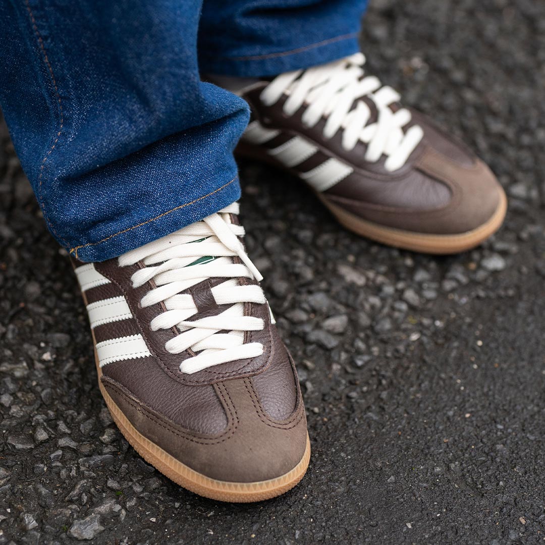 足元は『アディダス』のブラウンスニーカーをオン! デニムとの相性抜群で、こなれ感もばっちり。