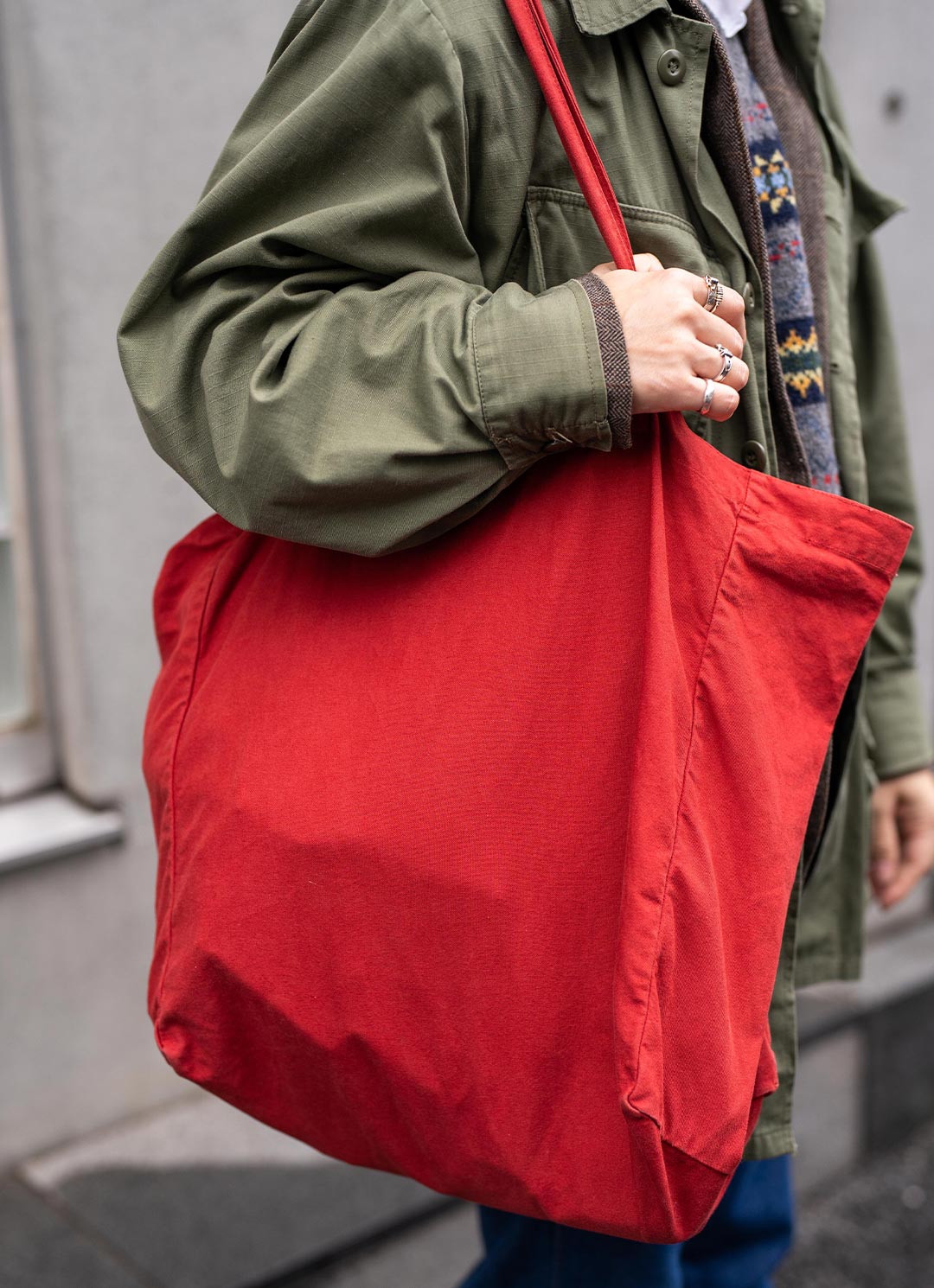 鮮やかな赤のトートバッグが挿し色役に大活躍! スクエアのマチに、ビッグシルエットなのが子連れに嬉しいポイント。