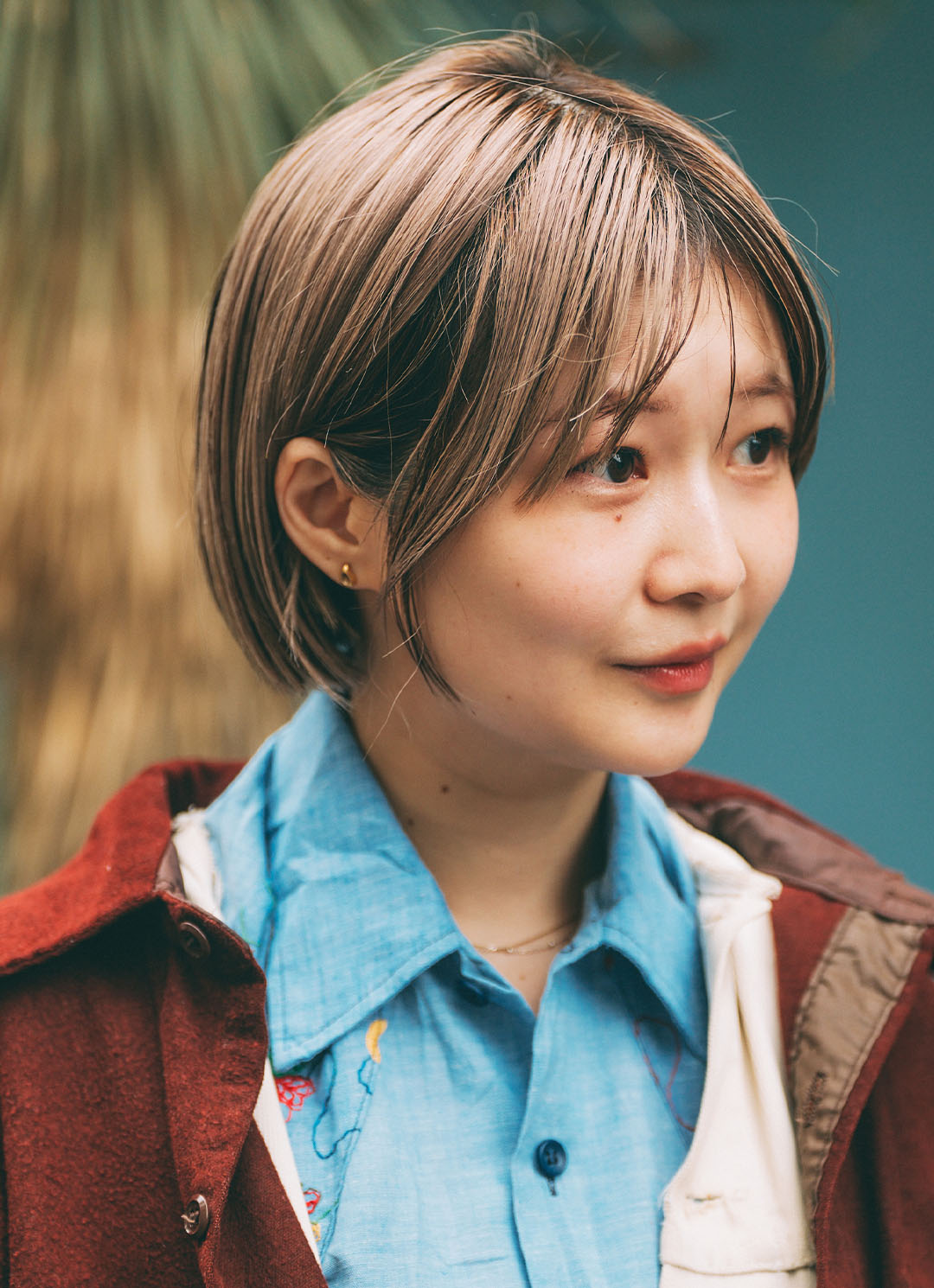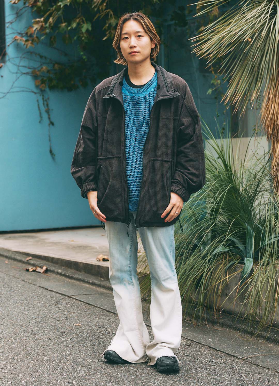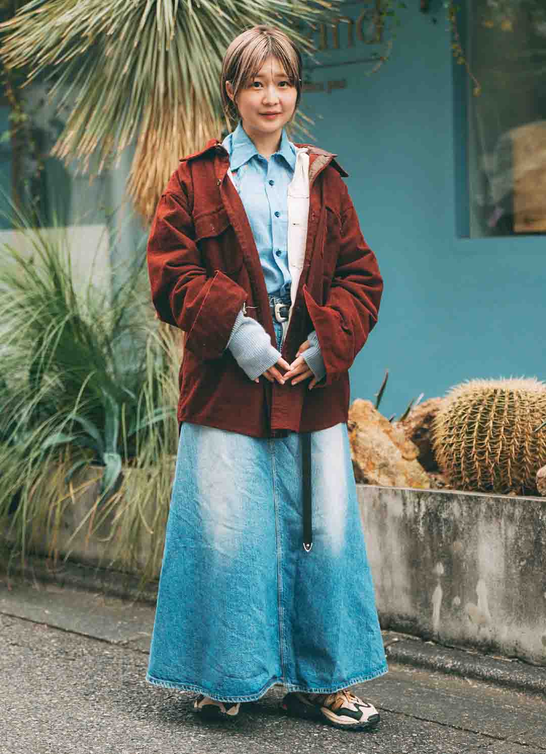 ハイトーンカラーのヘアが、冬の街並み映えるアクセント代わりに抜擢! 『H&M』のブルーのシャツは刺繍リメイクしたもの。