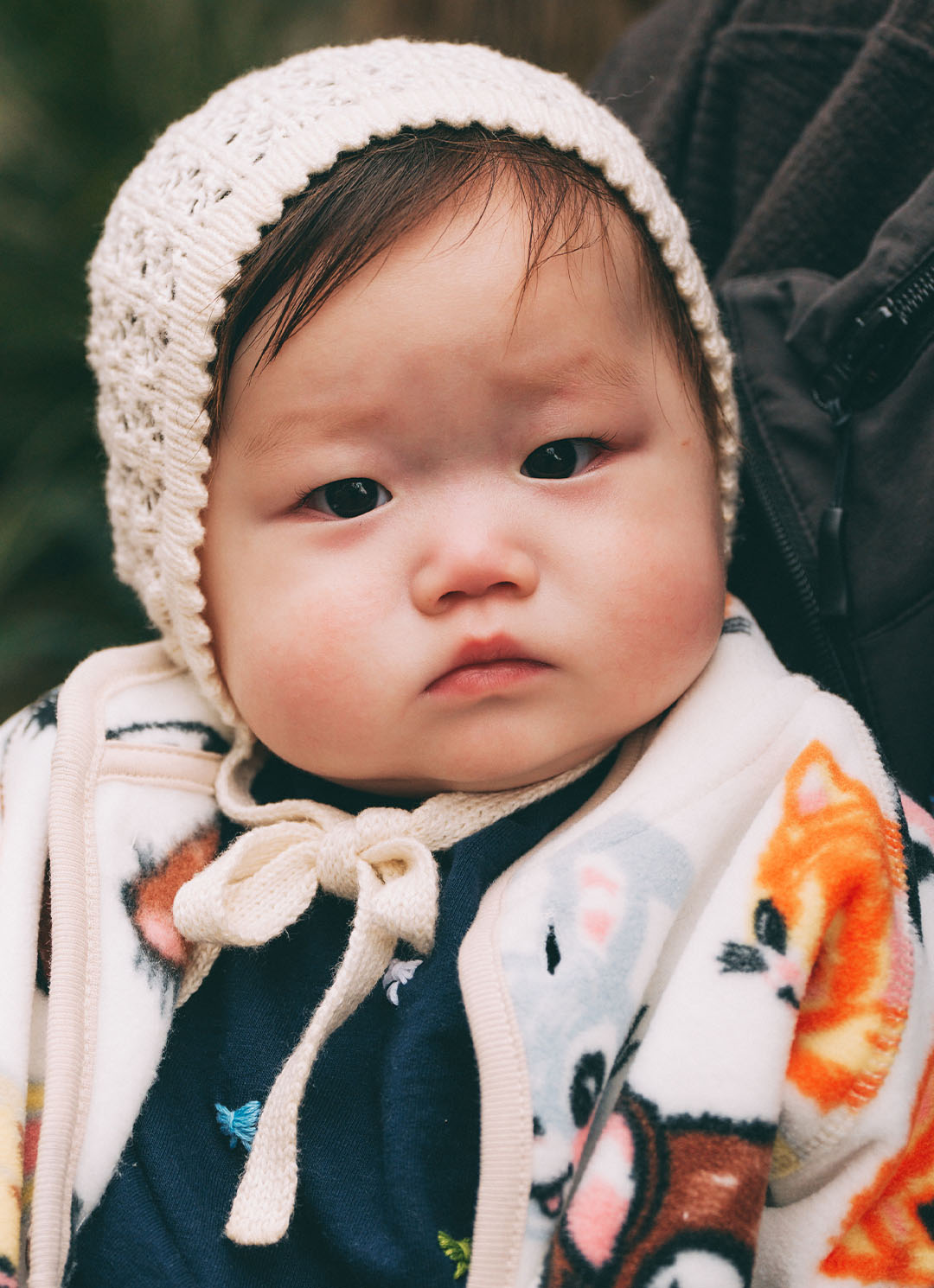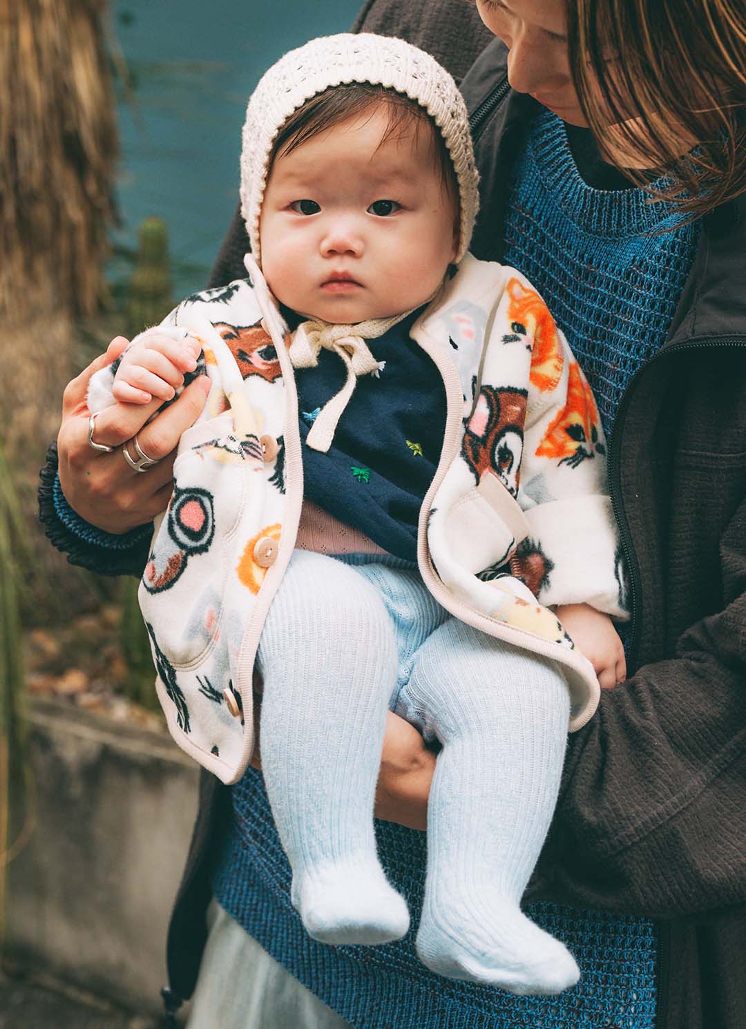 ベビーのユニークな動物柄のアウターが主役! 対してママパパはシンプルにまとめて、引き立て役にまわったバランス感はお見事。家族でヴィンテージを投入、淡いブルーをシェアして、こなれ感あるファミリーリンクコーデの完成♪