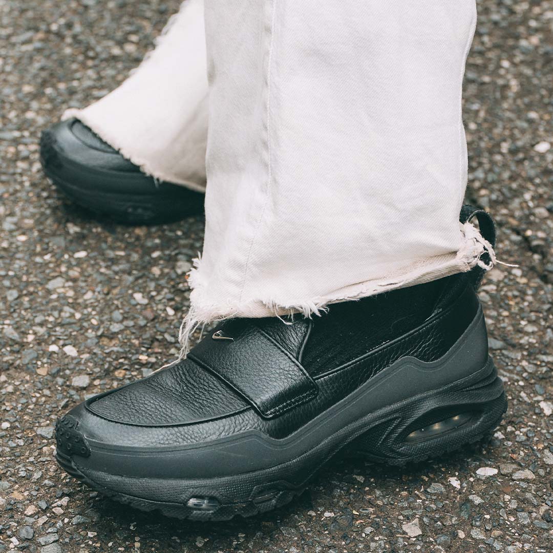 足元は『ナイキ』ローファーシューズをオン! ブラックレザーとスニーカーという、ハイブリットなデザインが新鮮。