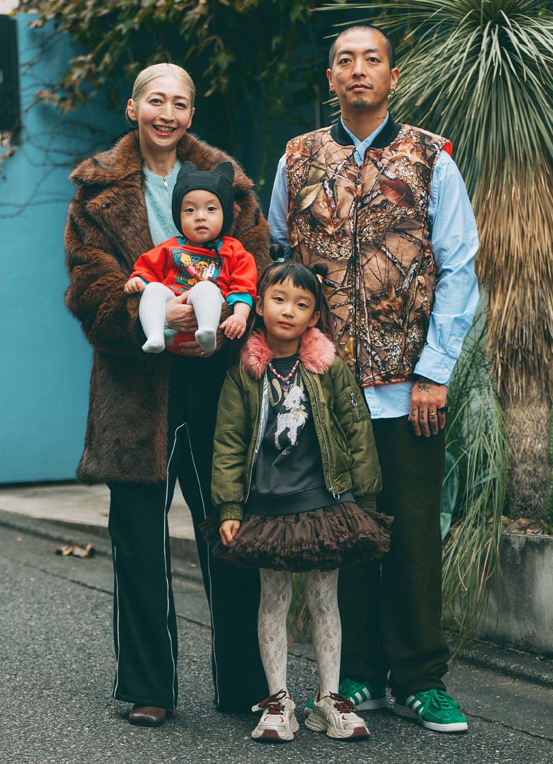 ファーコートや柄ベストなどインパクトのあるアウターを纏ってオリジナリティを発揮! みんな好き好きのアイテムを選びながらも、素材感やトーンを揃えてまとまりのある、洗練された家族コーデが完成♪