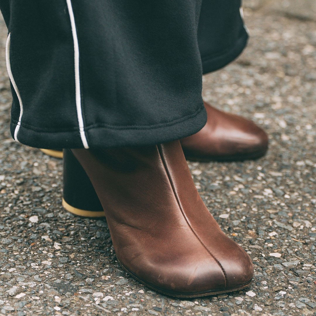 足元はブラウンレザーの『エムエムシックス』のブーツをオン! スポーティなボトムスをモードに格上げ。