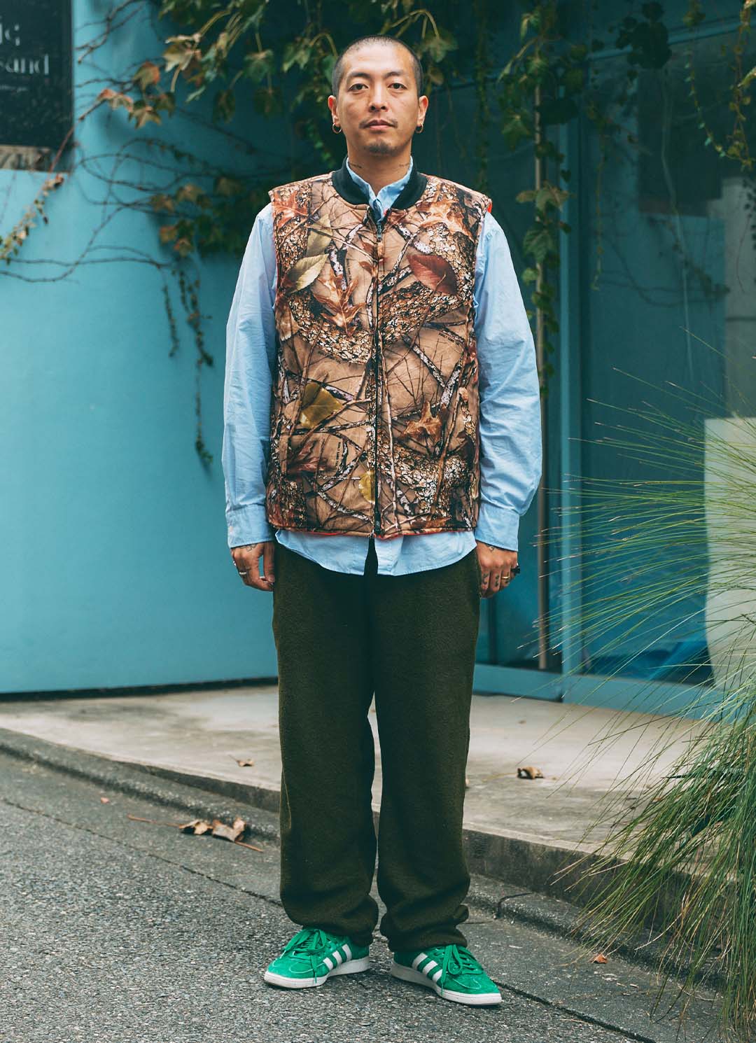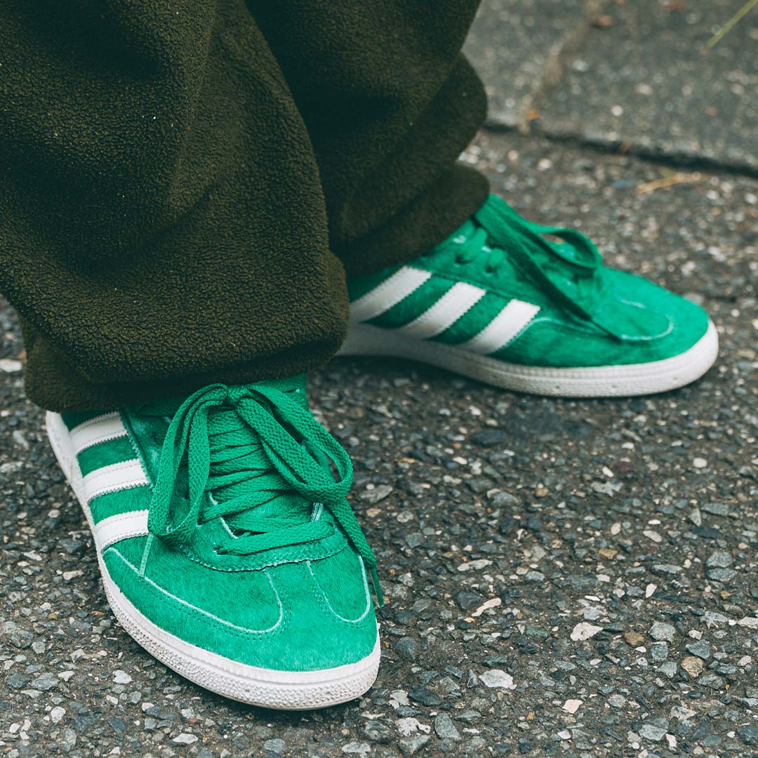 鮮やかなグリーンが目を引く『アディダス』のスニーカー。派手柄アウターに負けないカラーで好バランスに仕上げ。