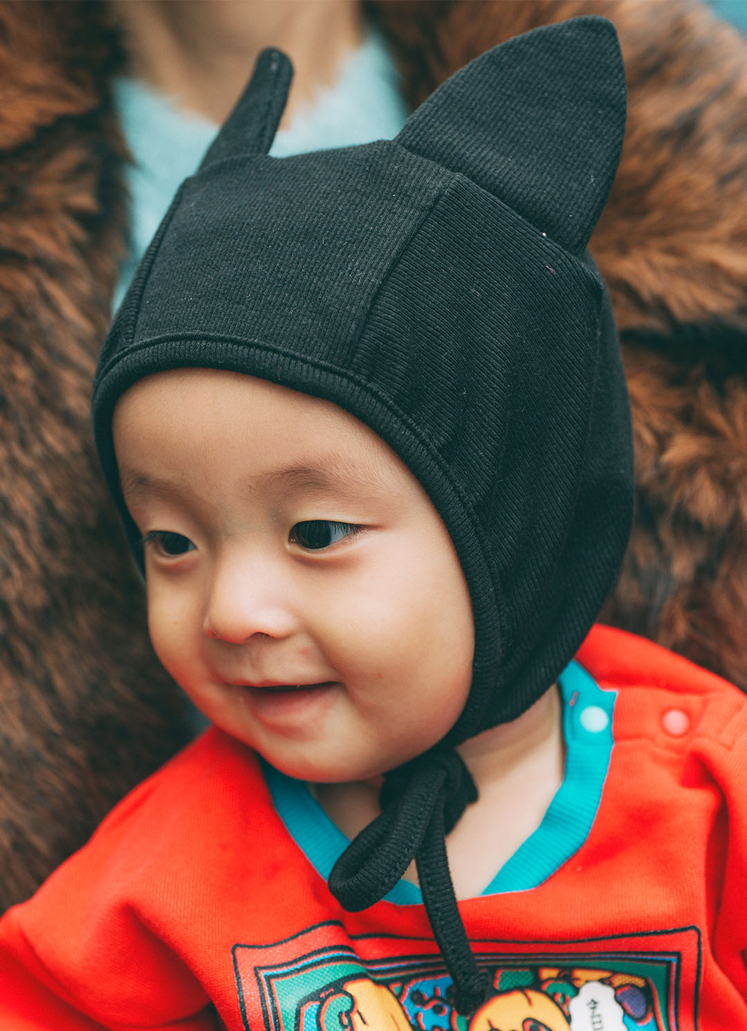 ネコ耳付きのボンネットを被ったベビーがキュート! この時期ならではのアイテムを上手くセレクトしたスタイリング。