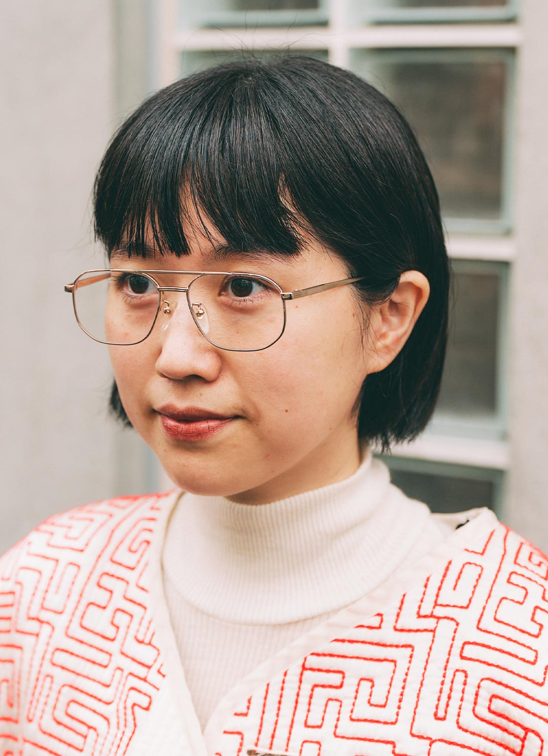 ダブルブリッジのメガネとクリーンなホワイトタートルで知的な雰囲気に。アウターがより引き立つアイテムセレクトはお見事!
