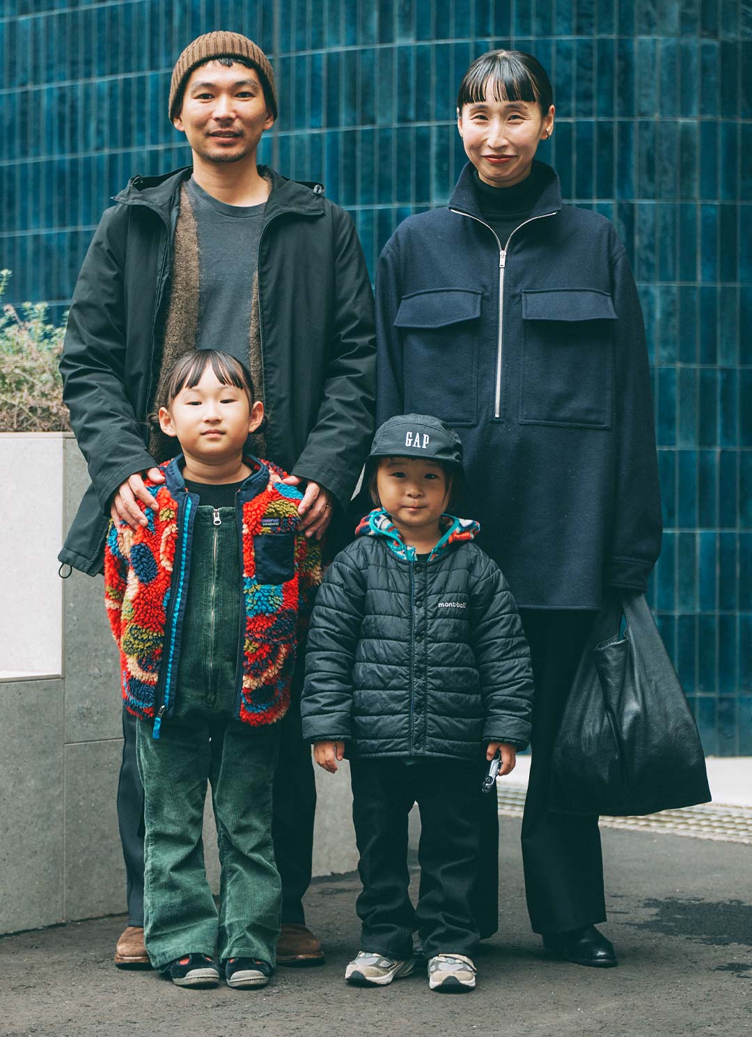 家族でブラックを取り入れて、モードな雰囲気漂う家族コーデは、異素材やフォルムで奥行きを出したのがサマ見えの秘訣。キッズはカラフルなアイテムを加えて、全体に華やぎをプラス!