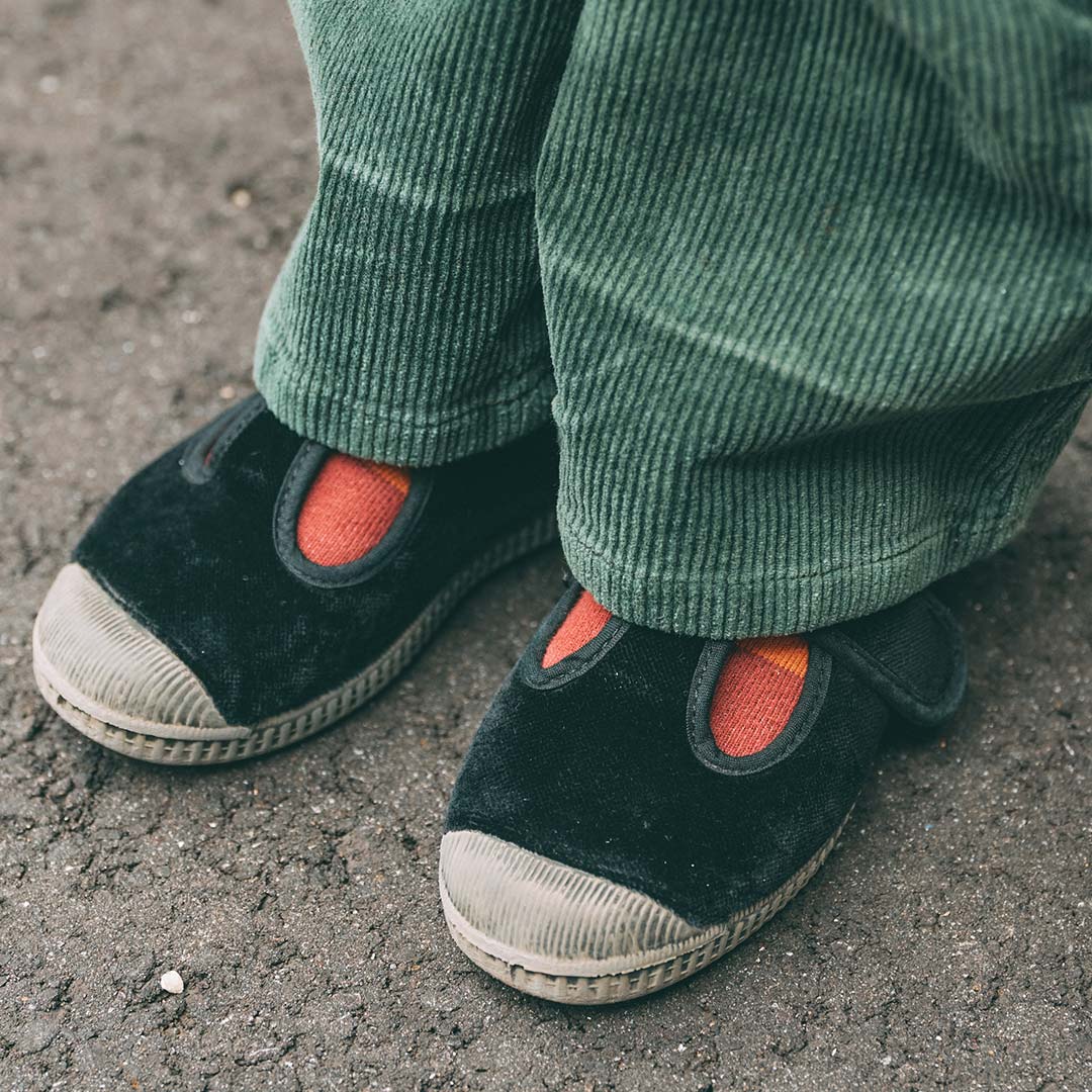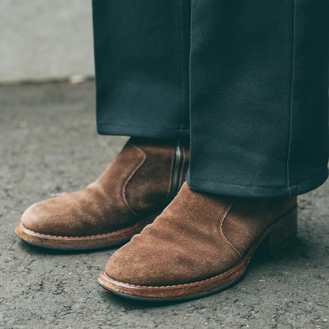 『シエンタ』のベロアシューズできちんと感ある足元にアップデート! オレンジのソックスで色を挿して、細部までこだわった着こなし。