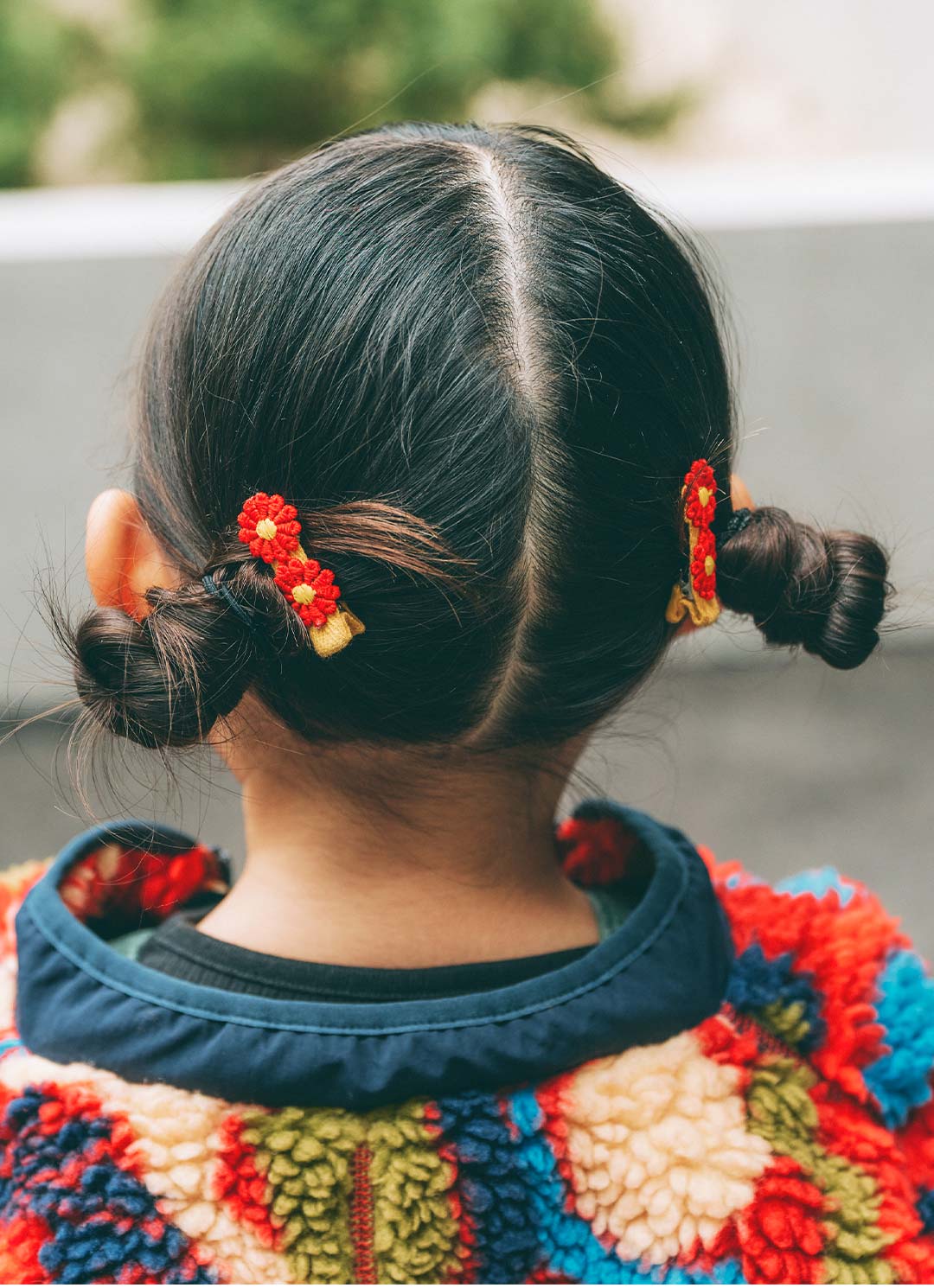 お団子ヘアをおはなのヘアアクセサリーでアクセントをオン! アウターから色を拾って統一感を出したのがポイント。