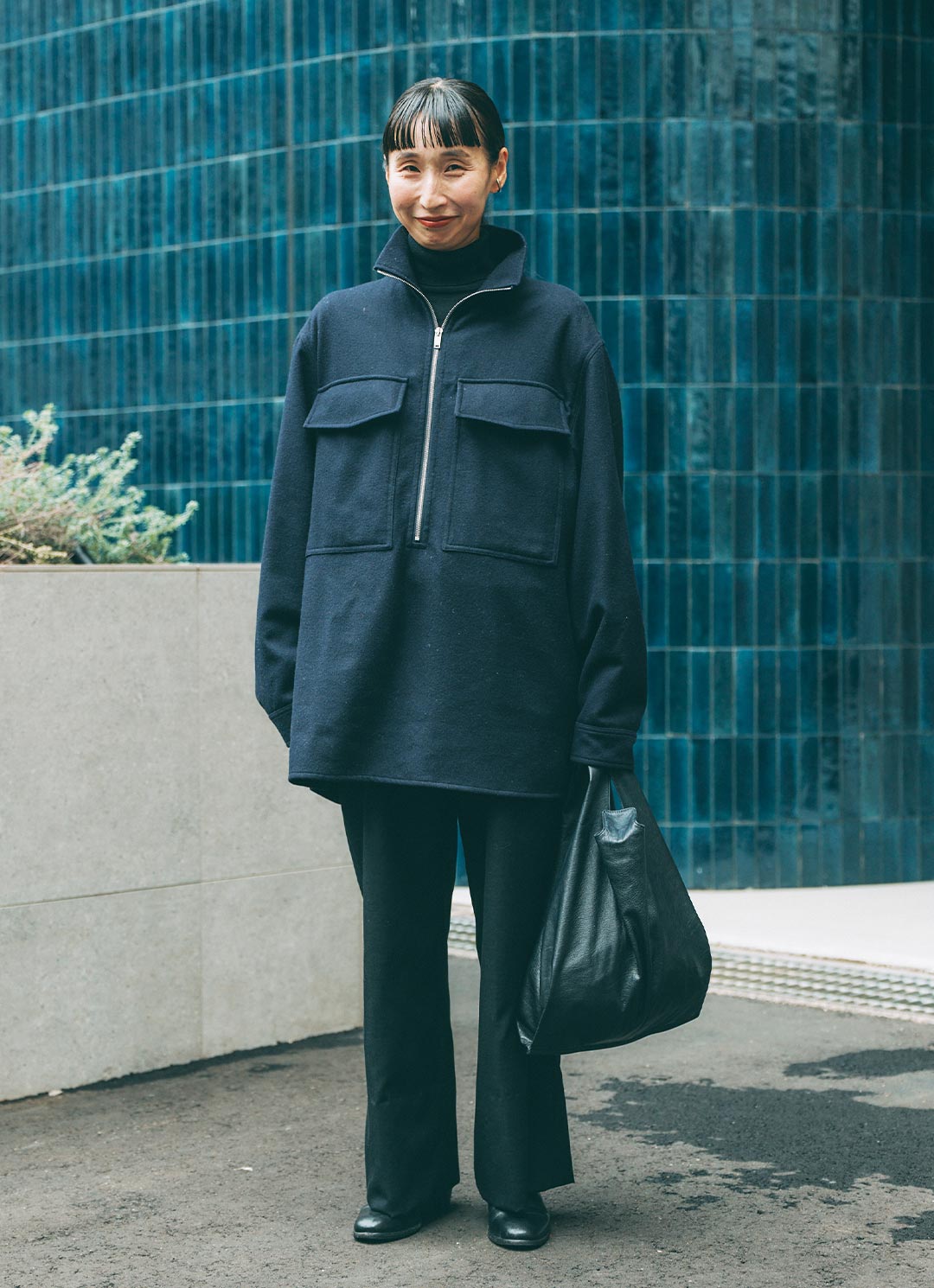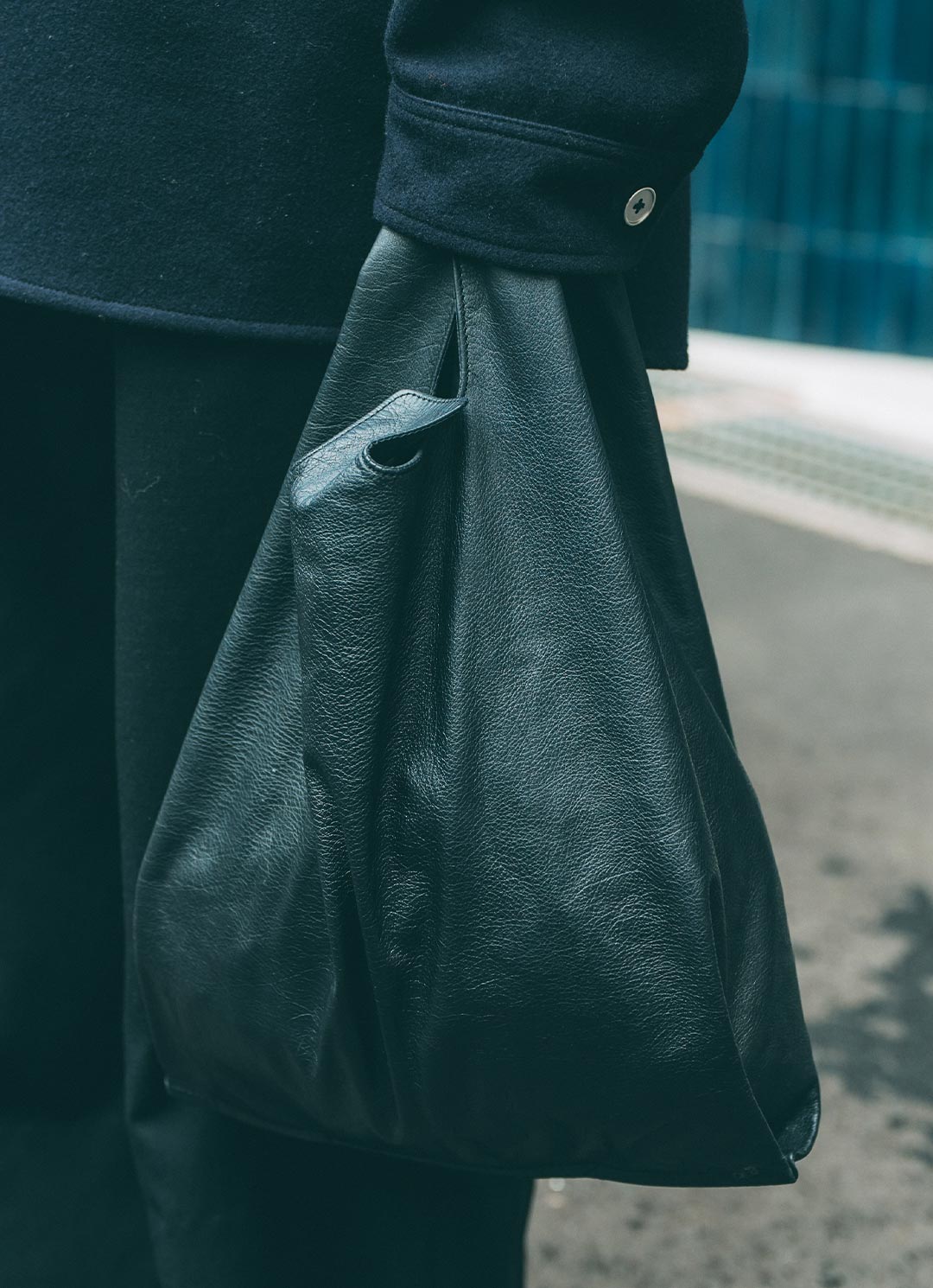 『ドレスドアンドレスド』のバッグでシックにまとめ。質感の異なるブラックアイテムを重ねて、立体感のあるモノトーンコーデに昇華!