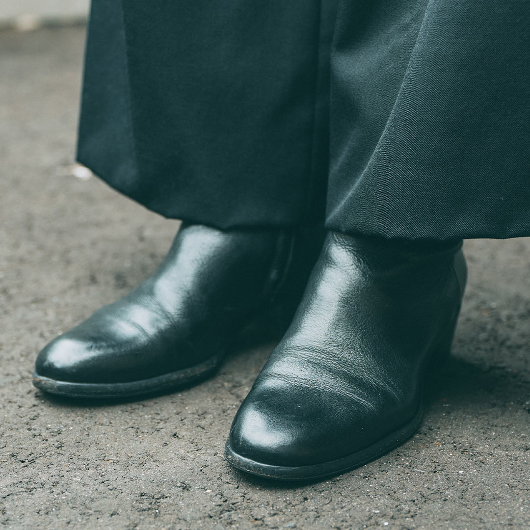 『メゾン マルジェラ』のレザーシューズが足元がさりげない存在感。冬の街に映える、洗練ムードを漂わせて。