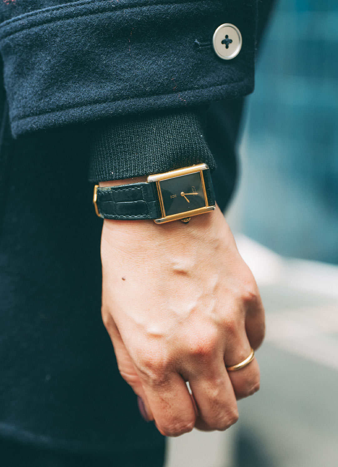 手元には長く愛される『カルティエ』の時計。モードな装いをマッチする上品なアイテム。