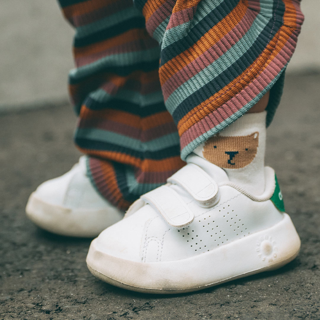 足元は『アディダス』のホワイトスニーカーで軽やかにまとめ。『アンドパル』のカラフルなリブニットをより引き立ててくれる。