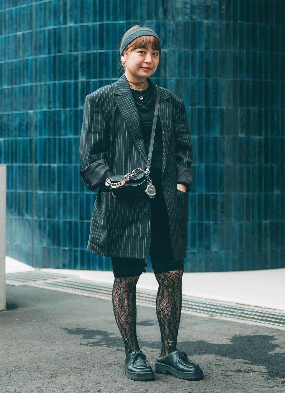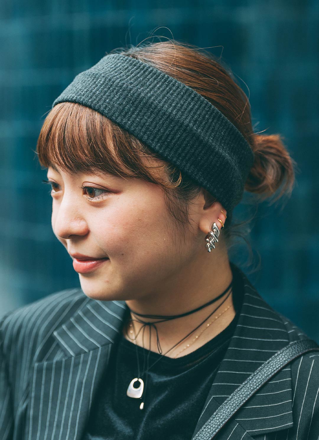 ジャケットコーデをニットバンドでカジュアルダウン! チョーカーとゴールドネックレスの重ね付けで、顔周りをリズミカルに仕上げたのがポイント。