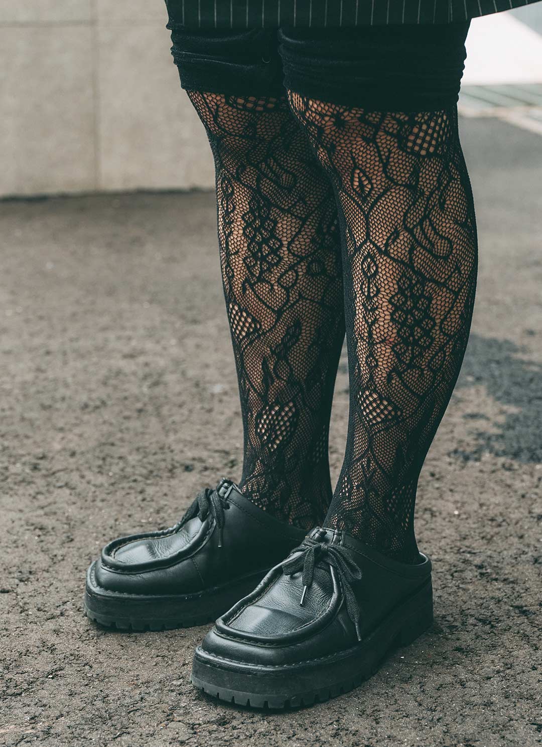 ブラックのレースタイツで静かな甘さをひとさじ。トラッドスタイルをほどよく崩して今どきに格上げ!