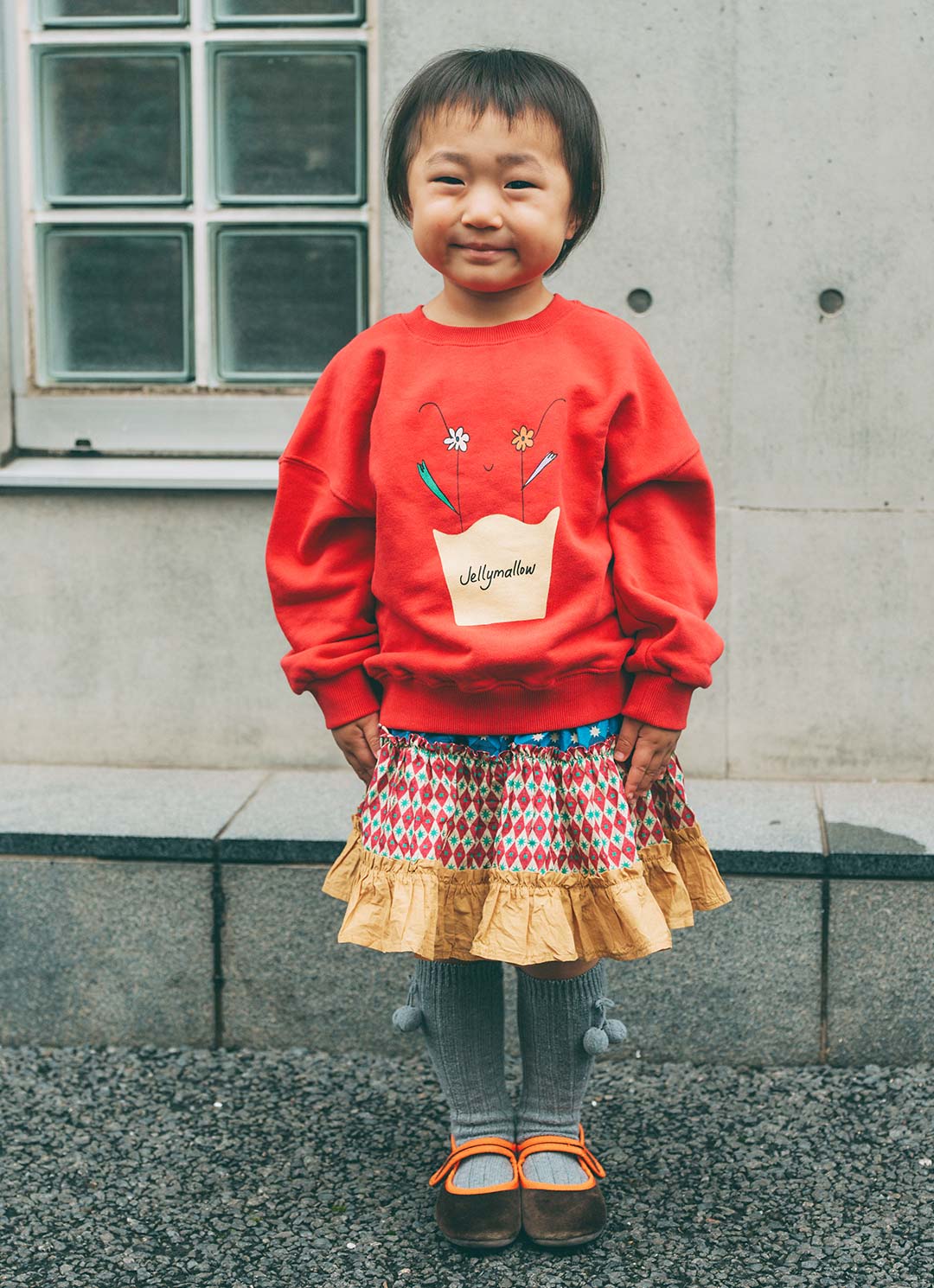 『シエンタ』のベロアシューズは、オレンジのリムがキュート! ポンポン付きソックスを合わせて子ども心くすぐるスタイリングに昇華♪
