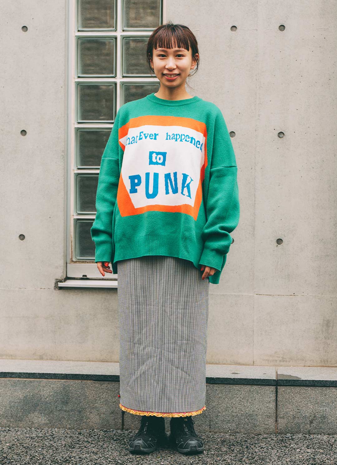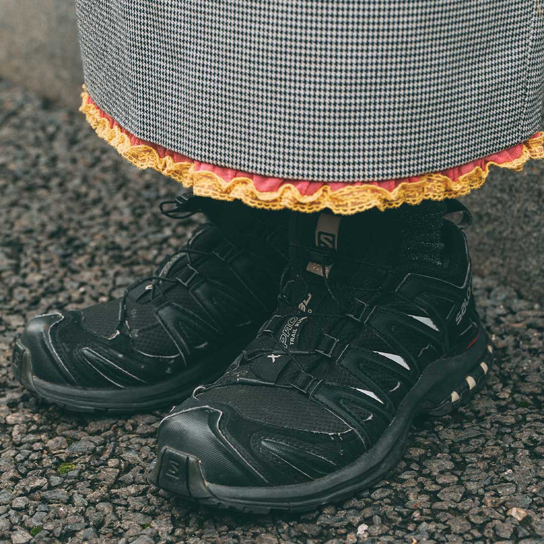 足元はアウトドアな『サロモン』のスニーカーをオン。甘いチェック柄スカートとのコントラストが絶妙!