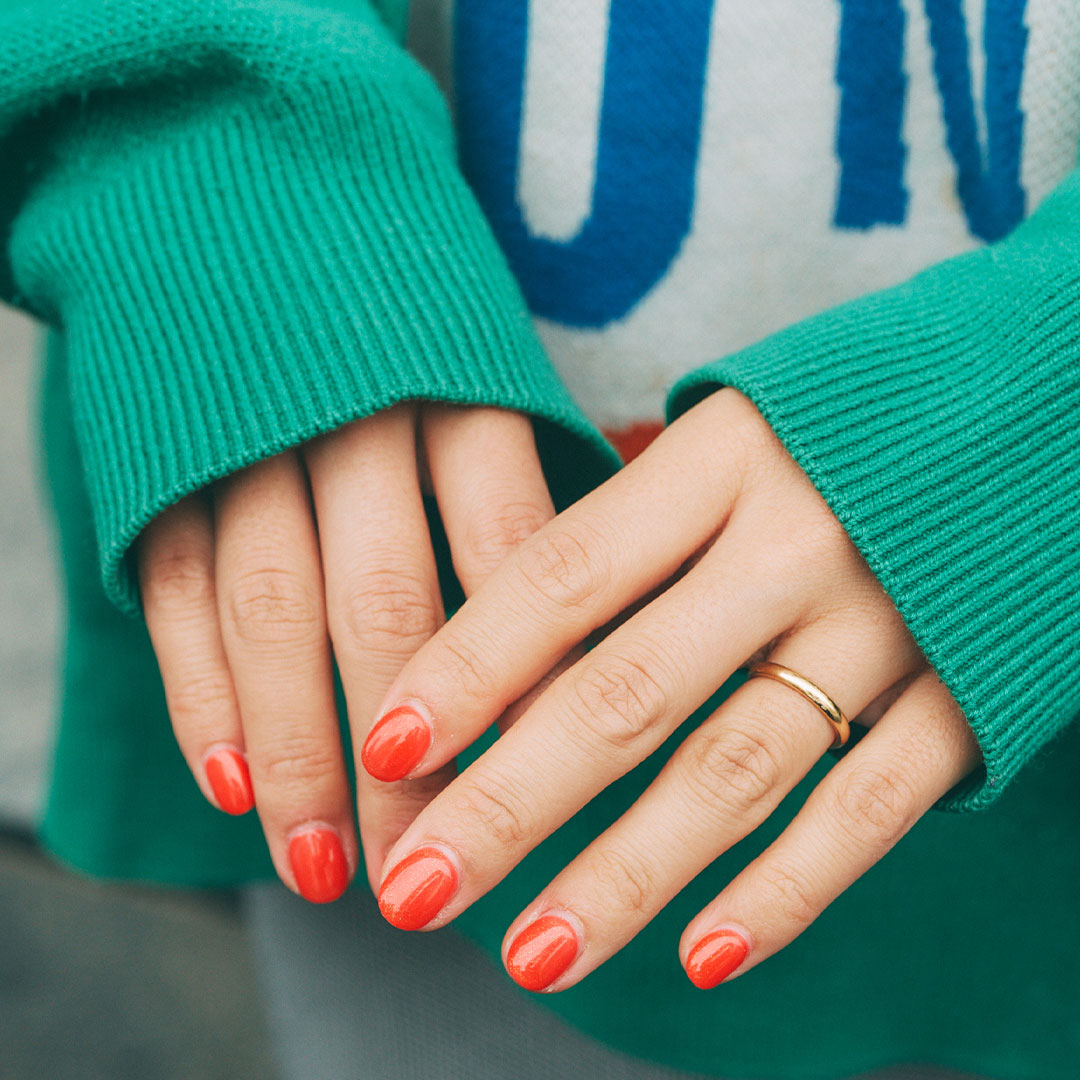 真っ赤なネイルがレディなアクセント役に抜擢! 指先まで抜かりないおしゃれ感度の高さが光る。