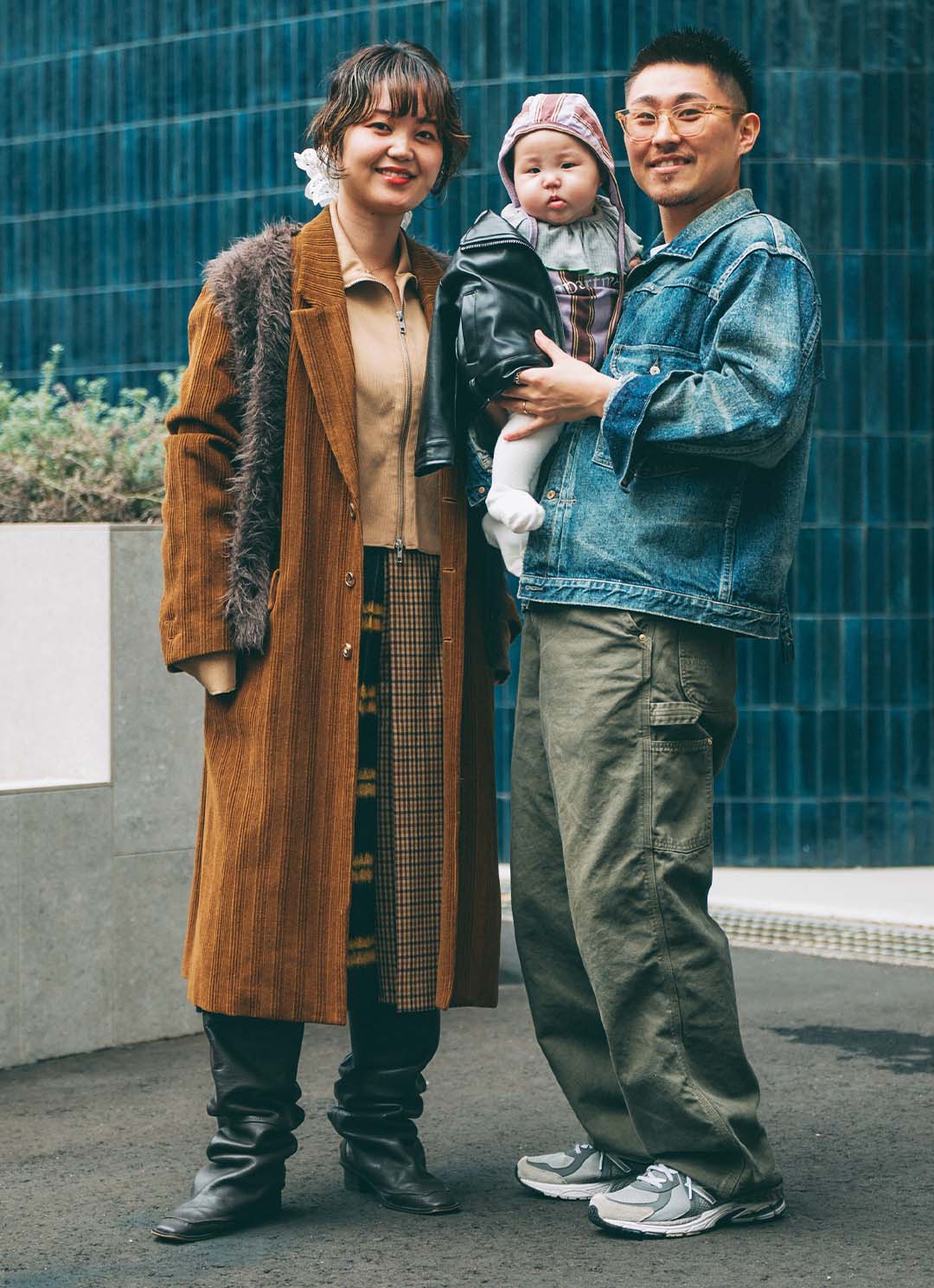 ベビーのロマンティックなパープルのセットアップを挿し色にした、冬のファミリーコーデがこなれ感抜群! カジュアルとモードをミックスして、肩の抜けたスタイルに仕上げるのがサマ見えのコツ。