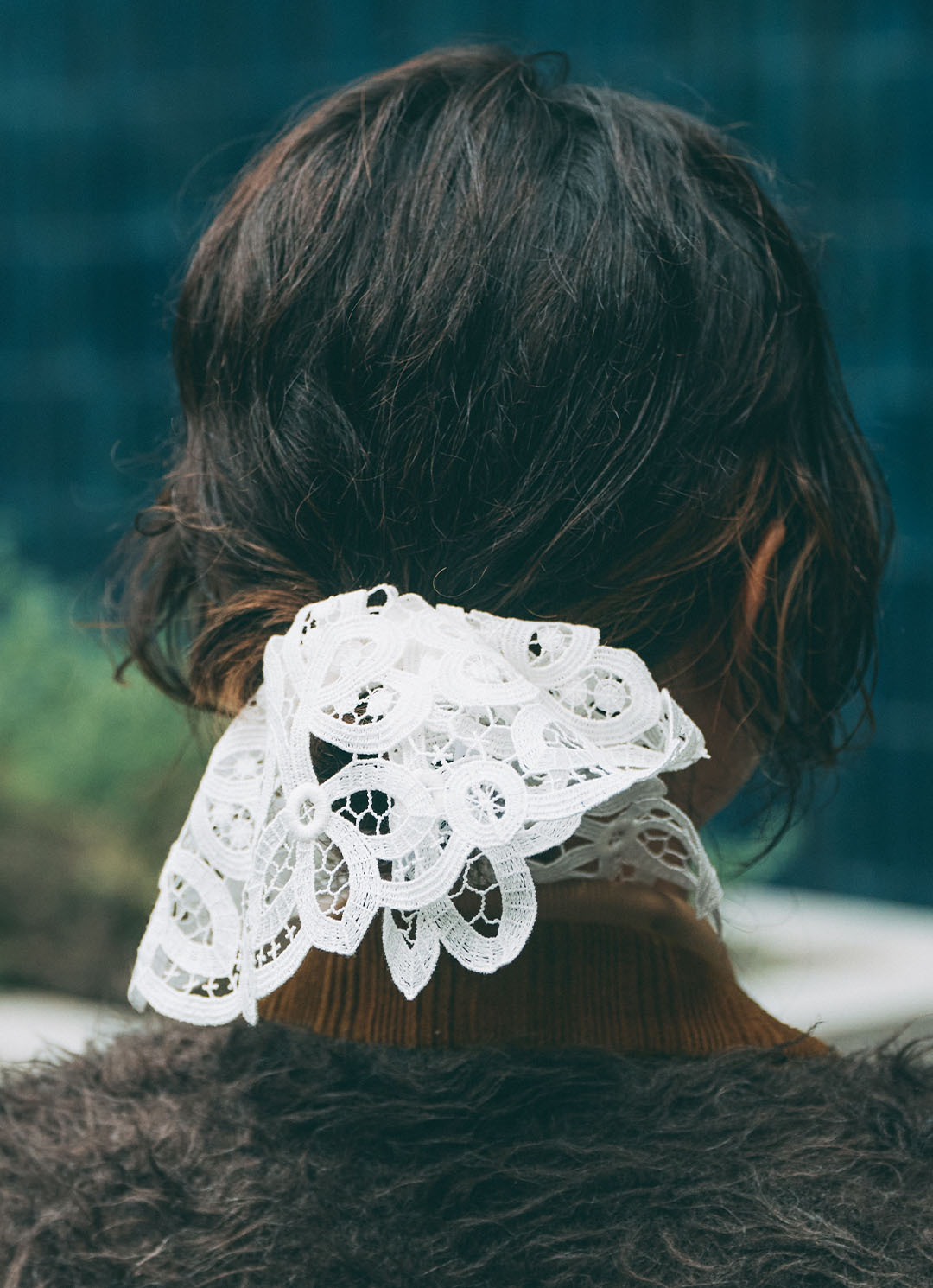 フェミニンなシュシュは『メゾンドリリス』のもの。トレンドのレースもヘアアクセサリーなら手軽に取り入れられる。