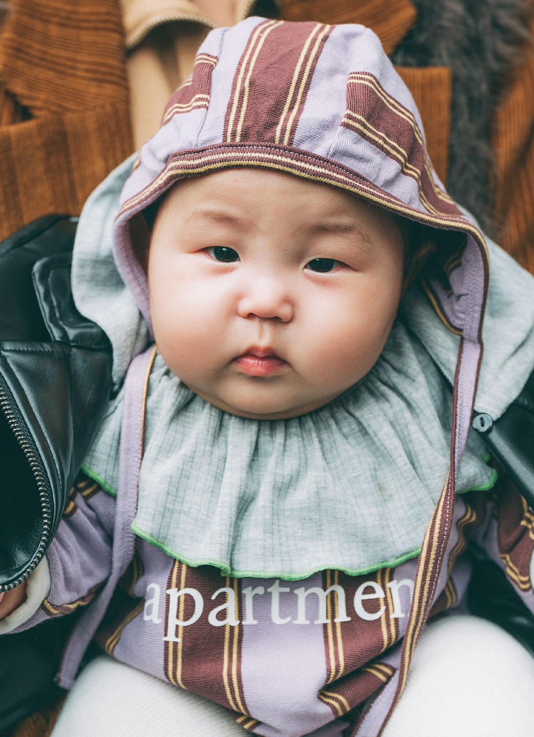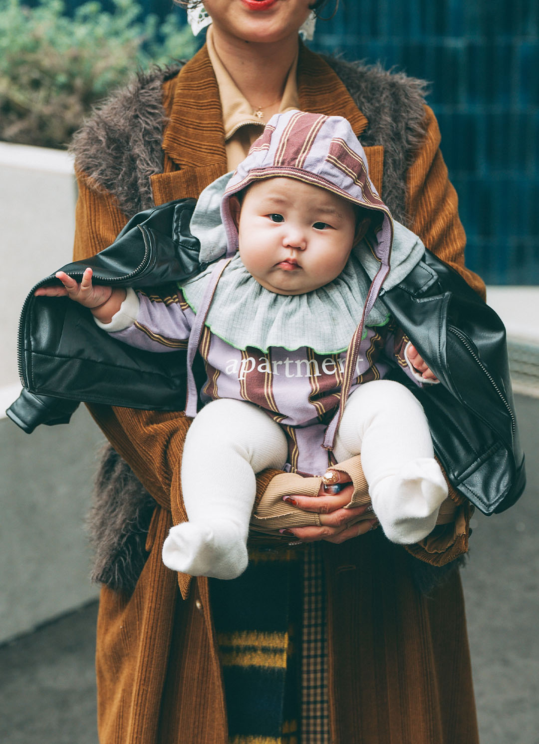 『セモン アパートメント』のボーダー柄が好アクセントなベビーコーデ。辛口なライダースを羽織って、甘辛に仕上げたのがグッド!