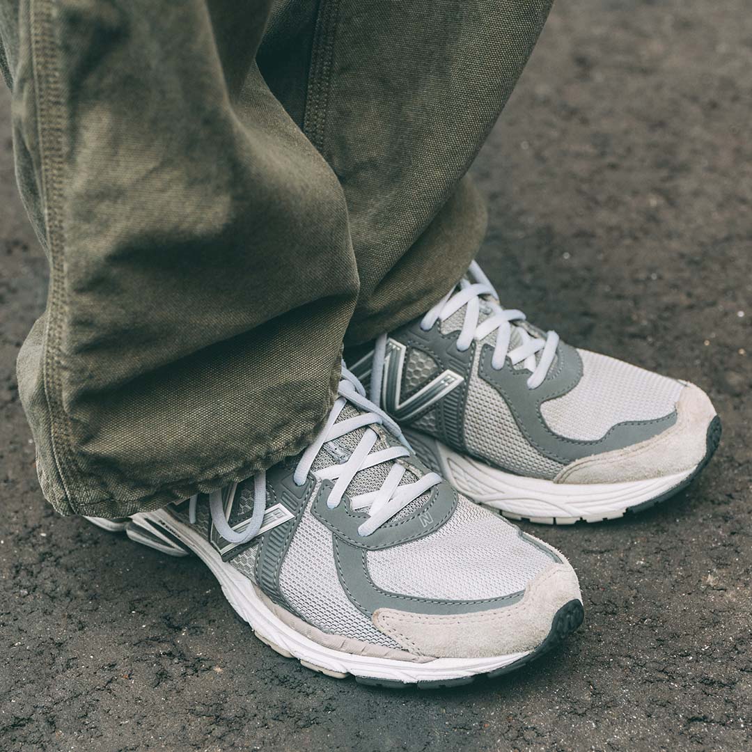 足元はスタイリッシュなラインが目を引くスニーカーをオン! ライトグレーが冬コーデを軽やかに仕上げてくれる。
