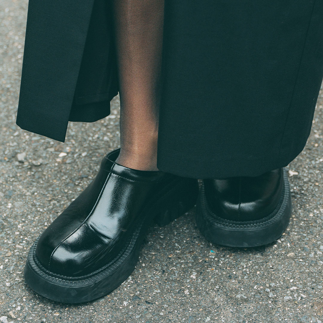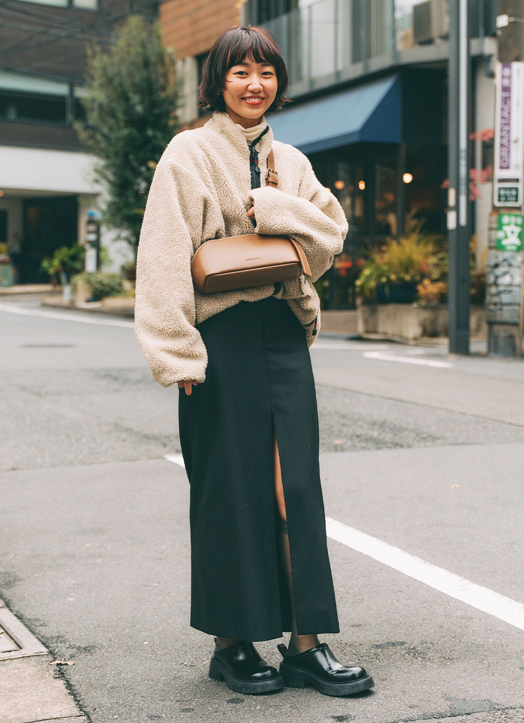 ストレートスカートに、厚底シューズでボリューム感を加えて、バランス良く。冬でも重くならない、抜け感のあるスタイリングテクニック。