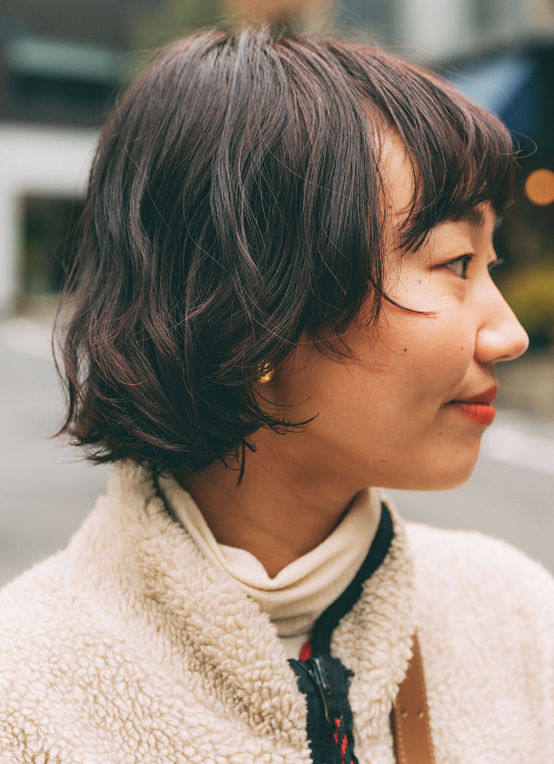 ナチュラルなウェービーヘアで顔周りに動きをプラス。ゴールドのピアスとレッドリップで上品さを添えて、メリハリをオン!