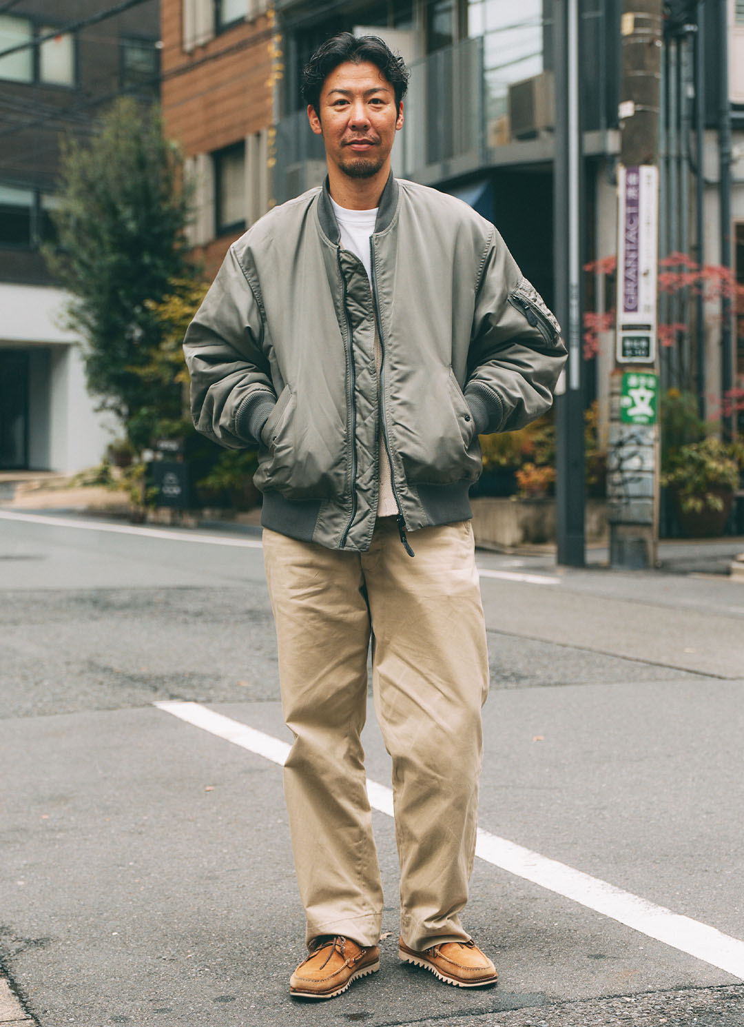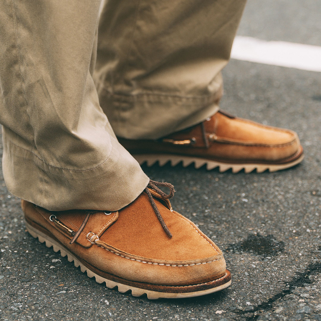『オーエーエムシー』のシューズはブラウンスウェードならではの色合いがグッド! チノパンツと合わせて、余裕のあるカジュアルムードを漂わせて。