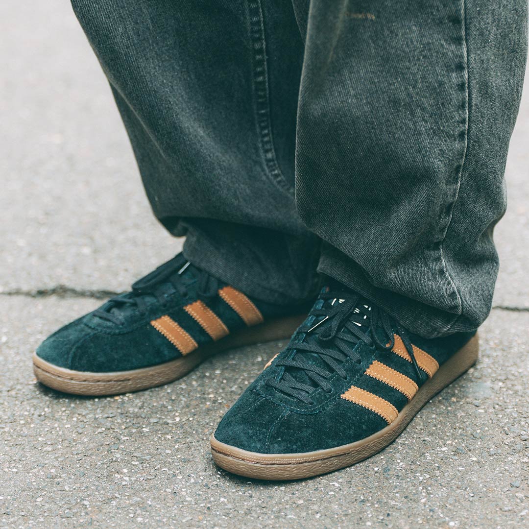 すっきりとしたシルエットの『アディダス』のスニーカーは、ゆったりめのボトムスと好マッチ! コーデと揃えたオレンジのラインで、統一感も忘れずに。