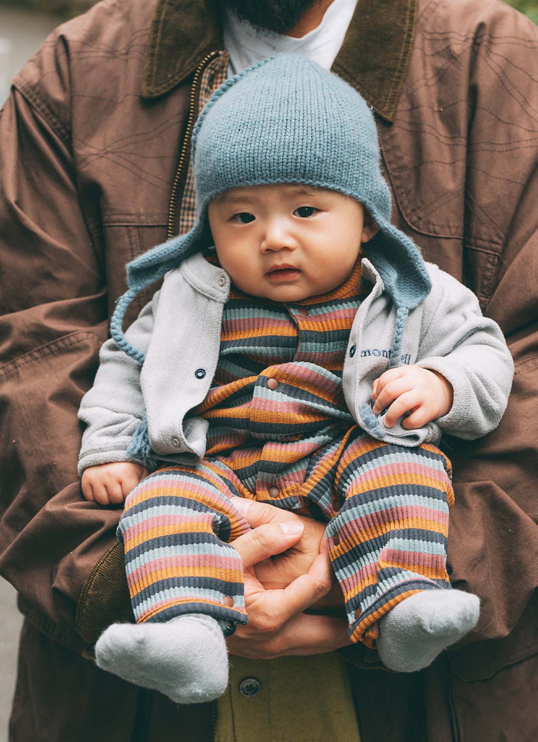 ボーダーをシェアしたきょうだいコーデが可愛い! チョーカーやビーニーなどのひと癖小物は、キッズたちのテンションを上げるスパイスに。ママパパはブラウンをベースに挿し色を効かせた、こなれた夫婦リンクコーデを満喫♪