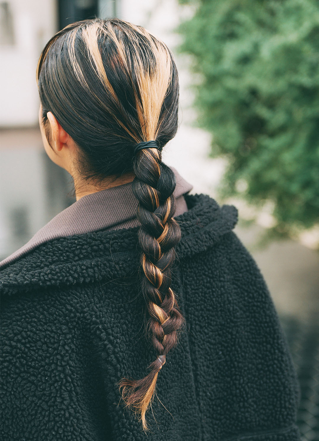タイトに編んだ三つ編みは、ハイライトが好アクセント! ボアアウターのボリューム感とバランスよく仕上げたバックスタイル。