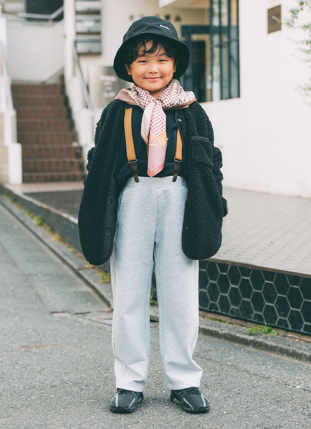 バケットハットにスカーフを合わせて、こなれ感ある顔周りに昇華! お兄さんムードで冬のお出かけが楽しくなるスタイリング。