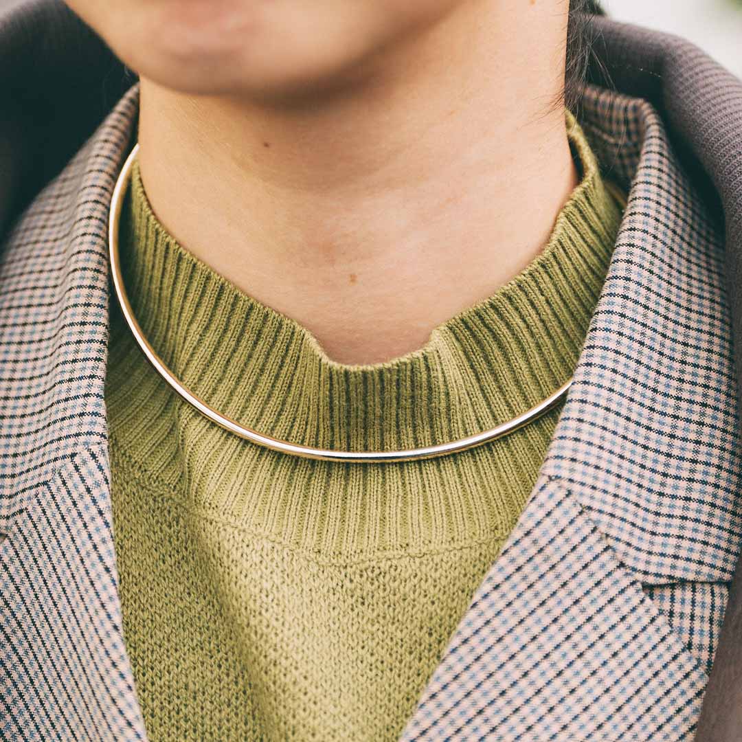 首元はモードなシルバーのネックレスをオン!異素材でレイヤードスタイルに立体感をプラスしてくれる。