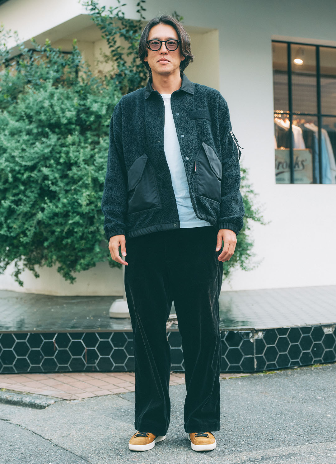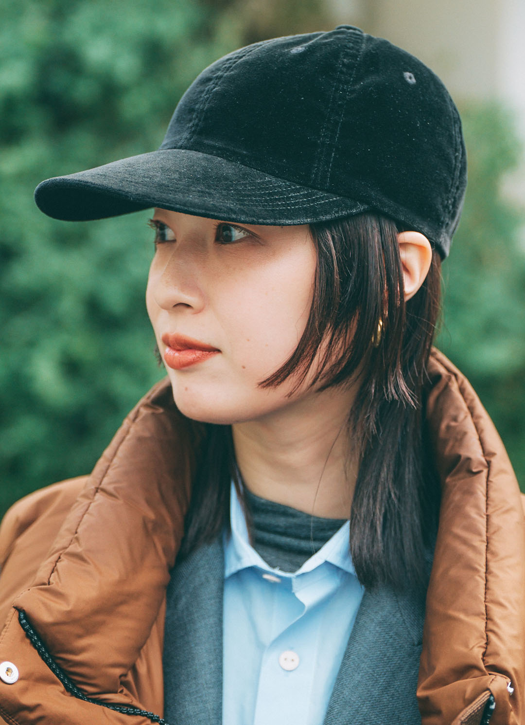 『キジマタカユキ』のキャップは冬らしい素材感に長めのプリムがポイント。ブルーシャツにグレーのインナーを見せて、カラーバランスもばっちり!