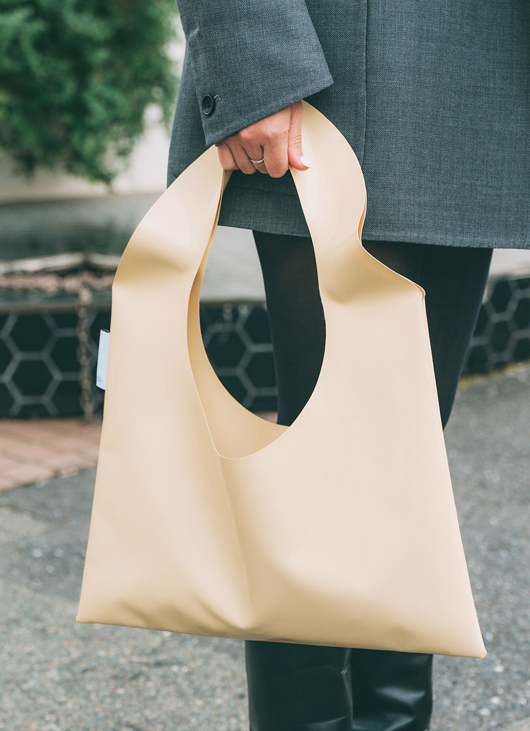 幾何学的なハンドバッグに視線集中! クリームイエローが、ダークトーンのコーデに映える挿し色に大活躍。