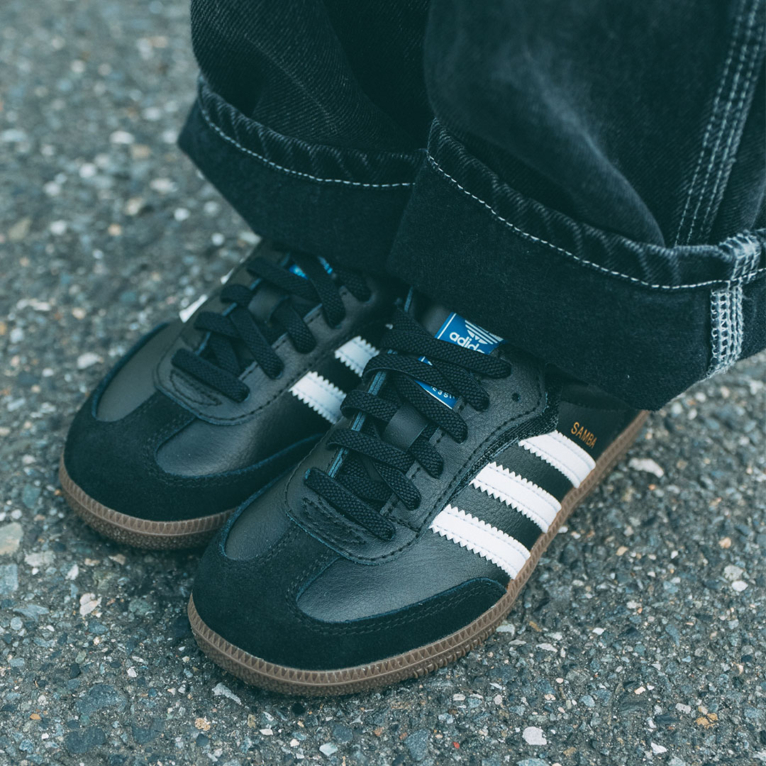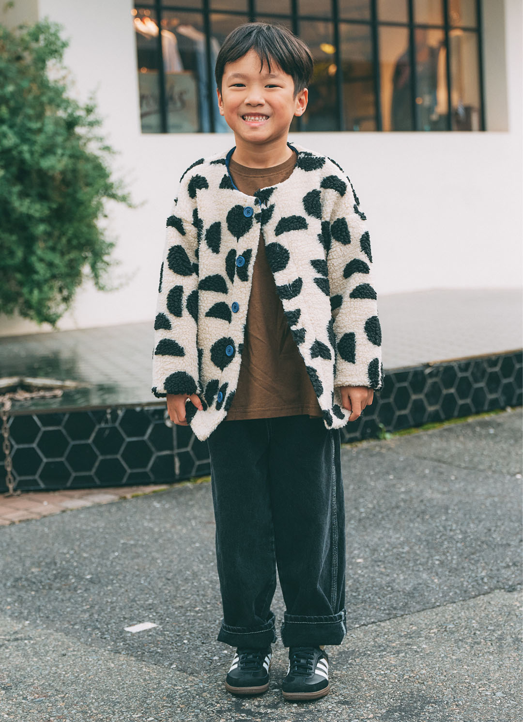 キッズは『アディダス』サンバのスニーカーをチョイス! ガムソールがこなれた印象をプラスし、アニマル柄コートとの相性も抜群。