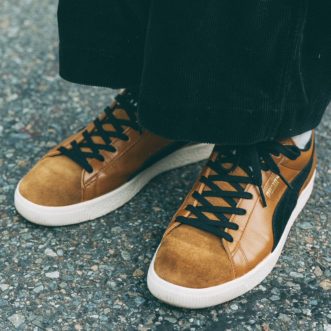 『プーマ』のキャラメルブラウンのスニーカーで、軽やかな足元に昇華! スウェードとレザーのハイブリットな素材がユニーク。