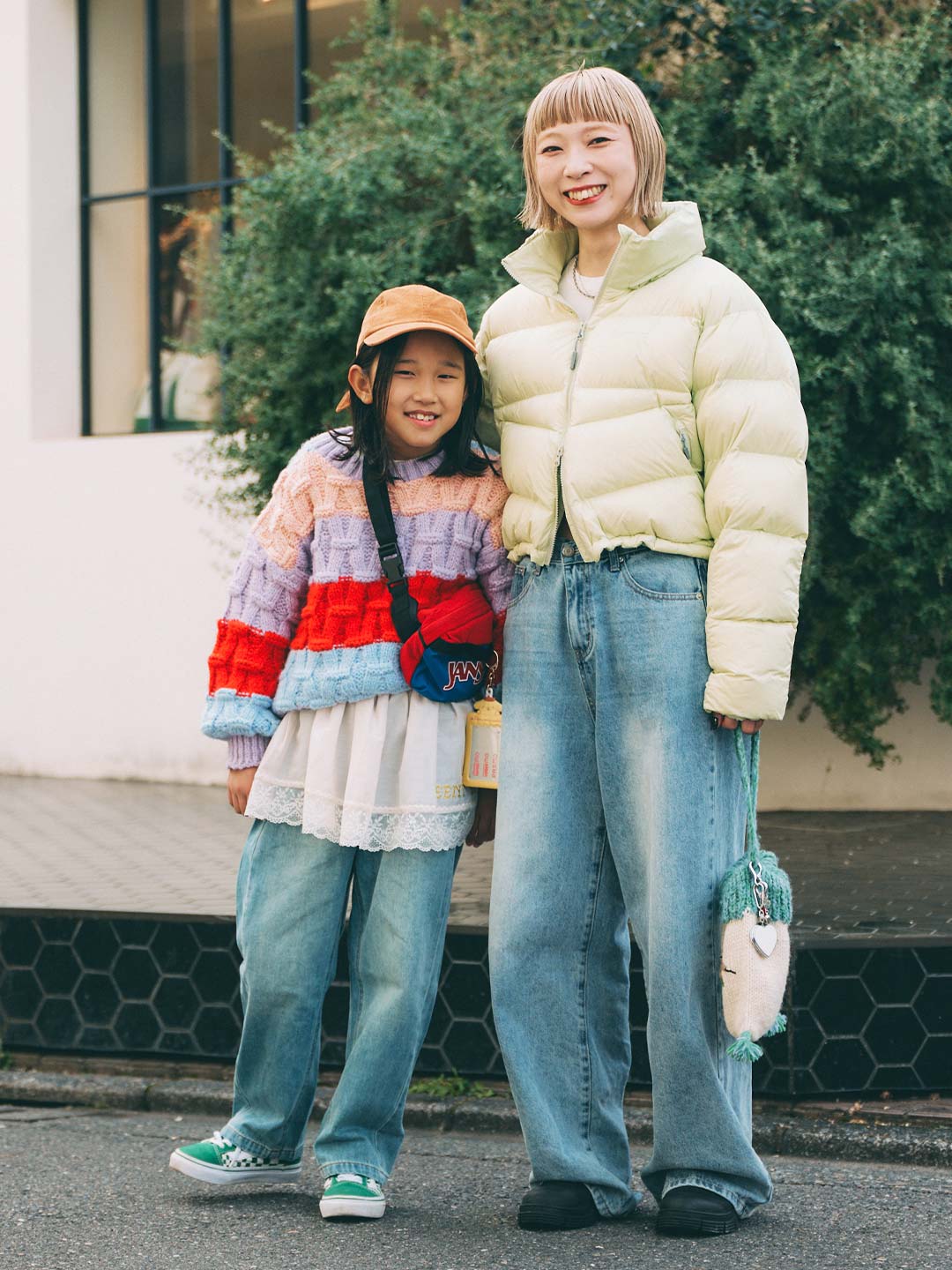 爽やかなライムグリーンのダウンやカラフルなニットなど、冬の主役となるアウターは明るめカラーを選ぶのが今どき。ライトカラーのデニムでトーンを合わせた、こなれ感抜群の親子リンクコーデはぜひ参考にしたい!