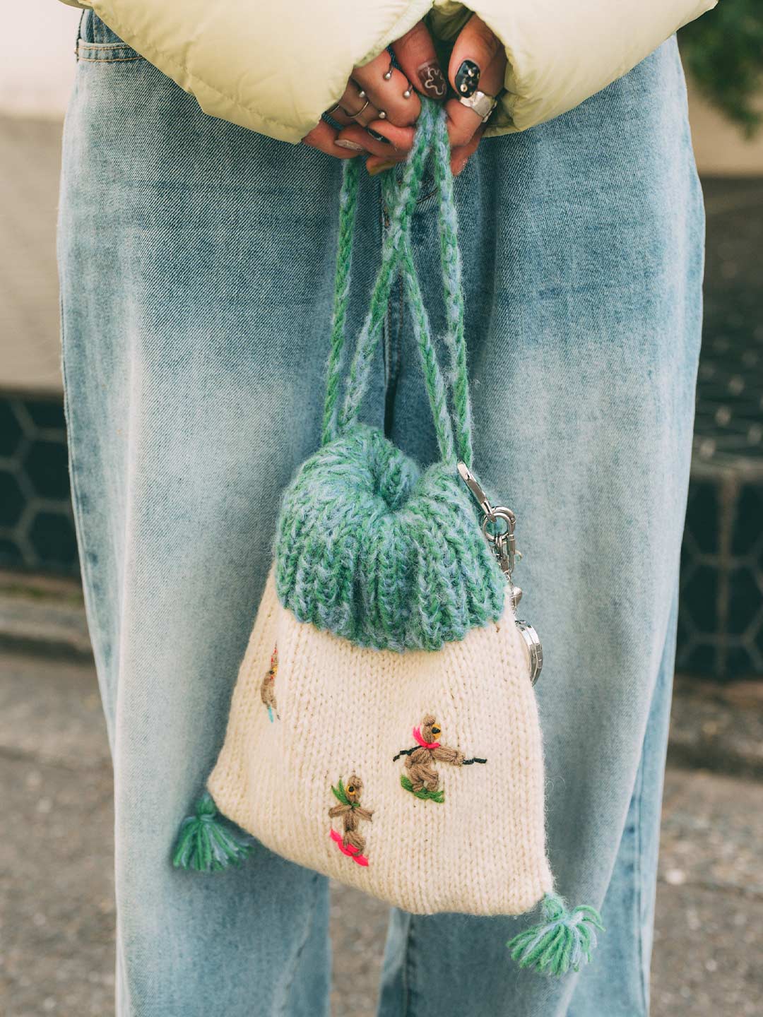 刺しゅうモチーフとタッセルが可愛い巾着バッグ。ニットならではのあたたかみを感じる、冬ならではのアイテム。