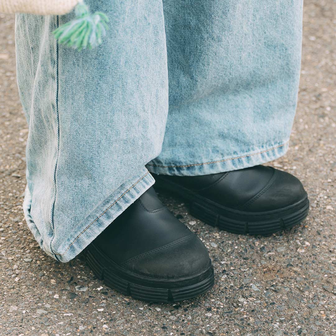 足元は『ガニー』のブラックシューズでコーデを引き締め。ぽってりとしたラウンドトゥのシルエットが、ワイドデニムとのバランスも絶妙!