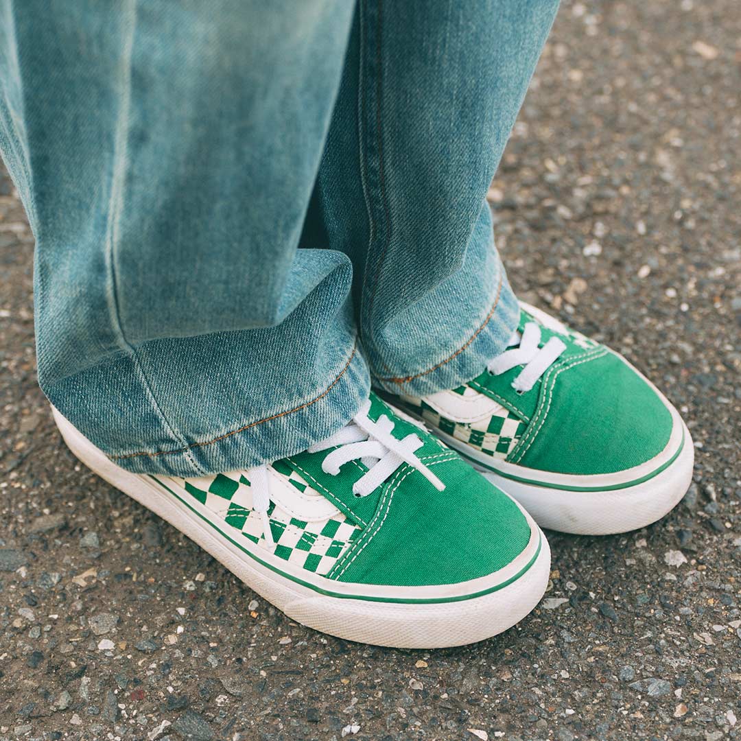 グリーンのチェッカー柄が効いた『バンズ』のスニーカー。重くなりがちな冬コーデを、鮮やかなグリーンが挿し色抜擢!