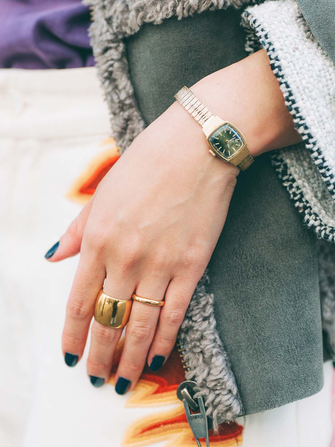 クラシックな時計とボリューミーなリング。重厚感あるゴールドで統一して、リッチな手元に格上げ!